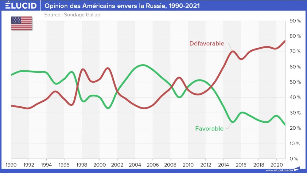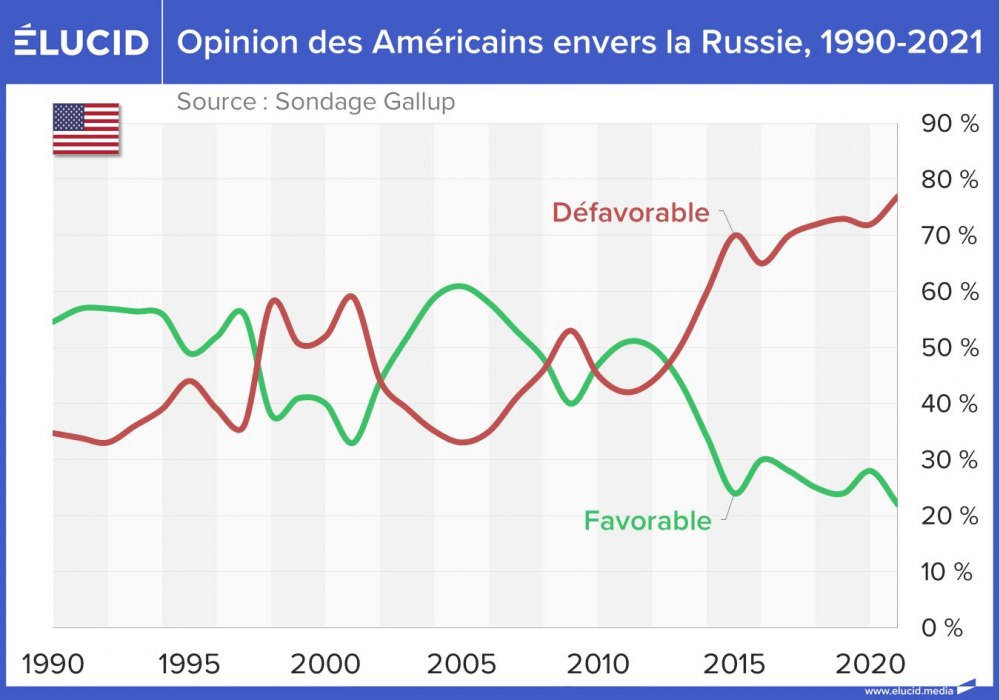 En 1989, à la fin de la guerre froide, selon les sondages Gallup, 62 % des individus interrogés avaient une opinion très favorable ou plutôt favorable de la Russie. En 2021, la tendance s’est largement inversée puisque ce chiffre est descendu à 22 %. Comment expliquer l’expansion de ce phénomène russophobe ? Il est étrange de voir les Américains vouer une telle haine à la Russie, alors même que cette dernière, depuis l’effondrement de l’Union soviétique, ne présente plus une menace stratégique et qu’il est difficile de trouver le régime Poutine pire que le régime Brejnev.