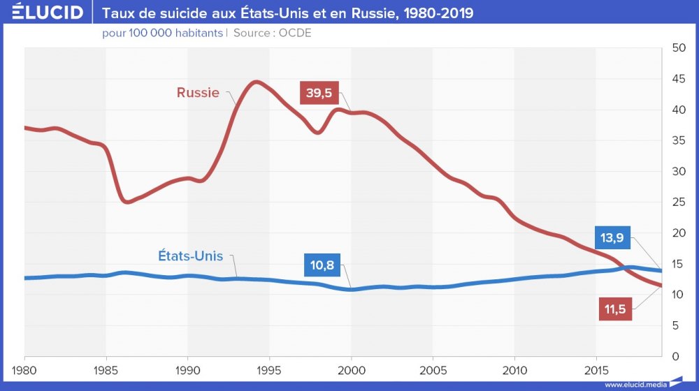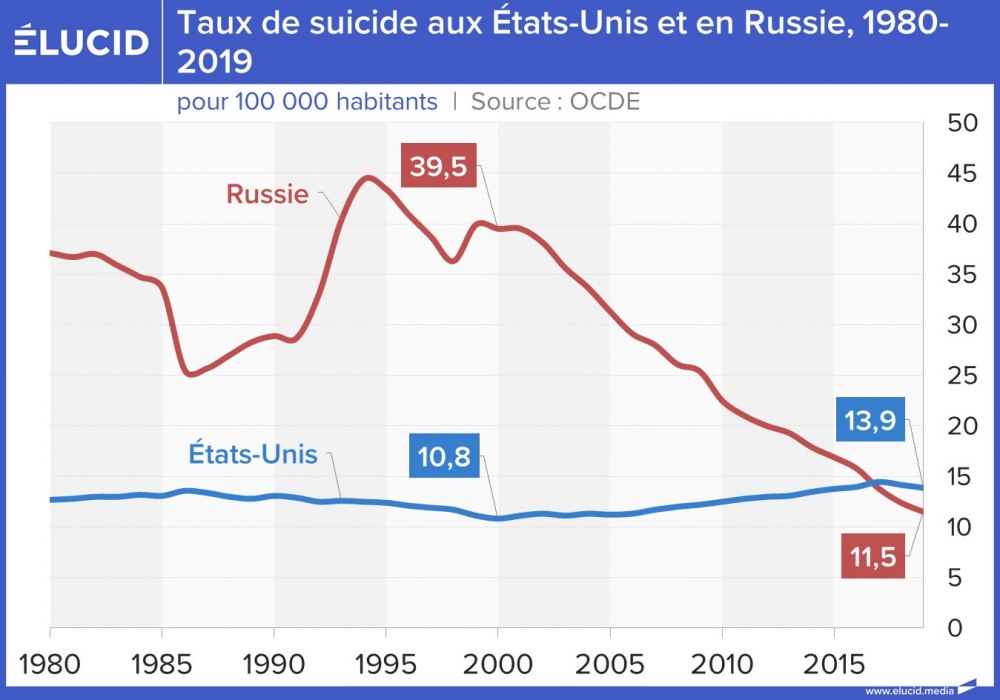 Toujours en retard sur ce plan, la Russie voit cependant son espérance de vie augmenter rapidement. D’ailleurs, le taux de suicide russe serait tombé, selon l’OCDE, en 2019 à 11,5 pour 100 000 habitants tandis que celui des Américains a atteint 13,9.