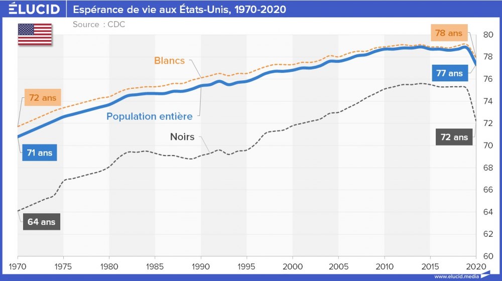 Pourtant, c’est bien l’argent des riches qui guide désormais les processus électoraux (ploutocratiques), c’est la mortalité de ceux qui n’ont pas fait d’études supérieures qui augmente, tandis que la mobilité sociale est désormais inférieure outre-Atlantique à ce qu’elle est en Europe. Les États-Unis étaient, dans les années 1920, le pays le plus riche du monde, responsables de près de 45 % de la production industrielle de la planète. Ils sont aujourd’hui confrontés à une baisse de l’espérance de vie – repérable avant l’effet majeur du Covid.