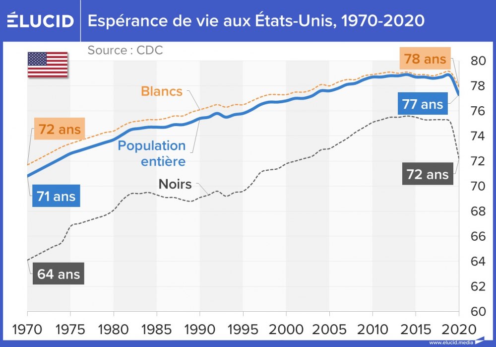 Second indicateur, l’espérance de vie. Dans leur ouvrage Deaths of despair (2020), Anne Case et Angus Deaton attirent notre attention sur sa baisse aux États-Unis, qui s’explique notamment par la hausse du nombre des suicides, des décès par surdose d’opioïdes et par l’alcoolisme chez les Blancs de 45 à 54 ans.