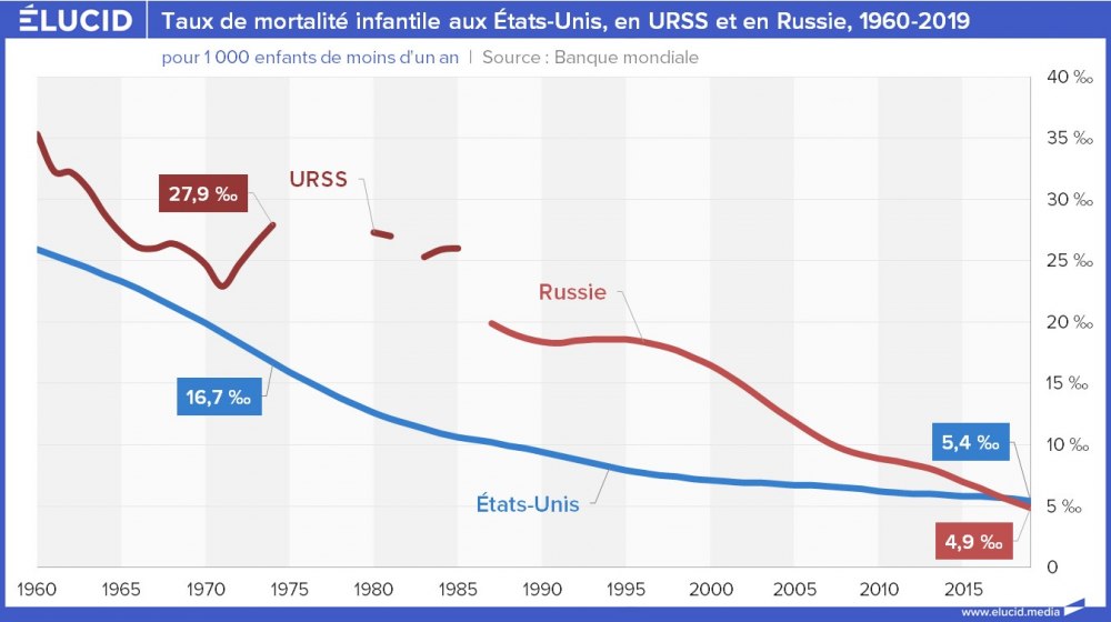 Le premier indicateur est celui-là même qui m’avait permis de prédire l’effondrement soviétique, le taux de mortalité infantile. Il était remonté de 22,0 à 27,9 pour mille naissances vivantes entre 1971 et 1974. En 1990, il était encore de 18,4. En 2019, il est tombé à 4,9 — en dessous du taux américain, de 5,4 ! Autrement dit, si l’on prend simplement le destin des enfants nouveaux nés dans leur première année, les États-Unis sont désormais en retard sur la Russie.