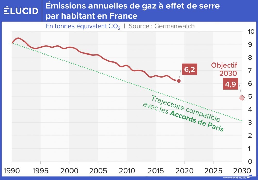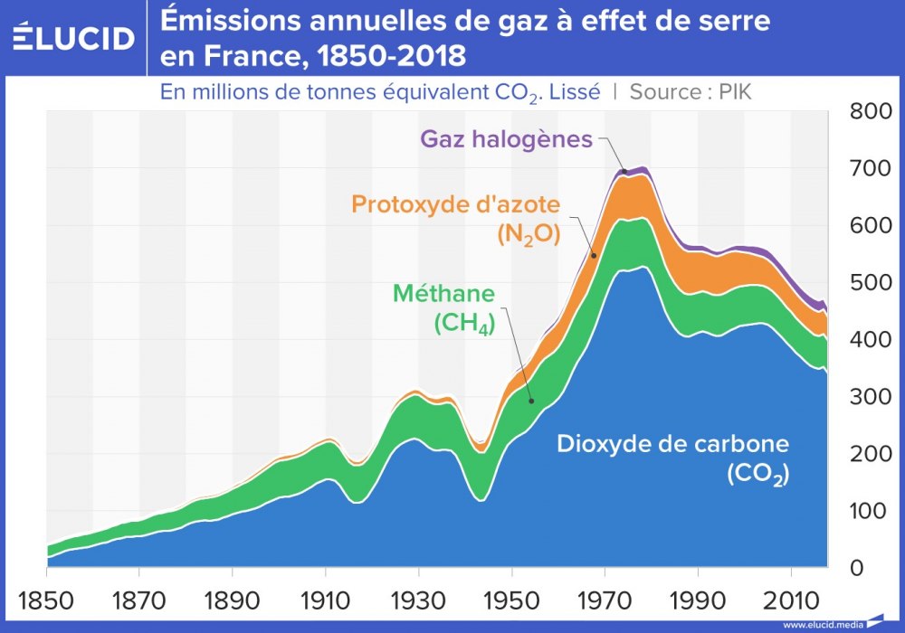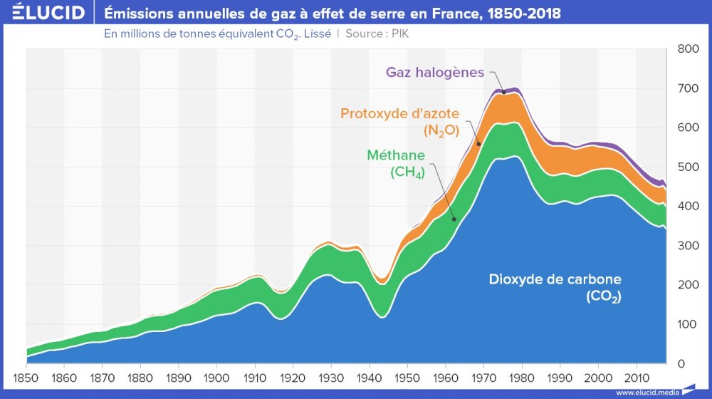 Depuis les années 1970 et les chocs pétroliers, la France a mené des politiques qui ont permis une baisse importante de ses émissions de gaz à effet de serre (GES). Nous sommes ainsi passés de 700 millions de tonnes équivalent carbone émis en 1979 à 450 millions de tonnes en 2018. Aujourd’hui, les Français héritent donc de choix politiques radicaux issus d'une période de crise. Cependant, des décisions politiques plus récentes viennent relativiser ces résultats en matière climatique.