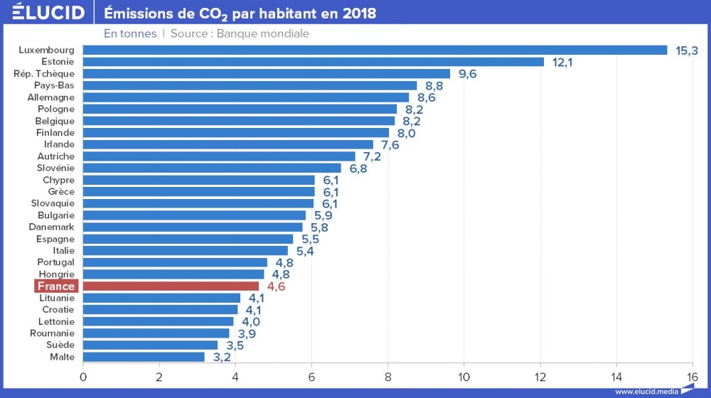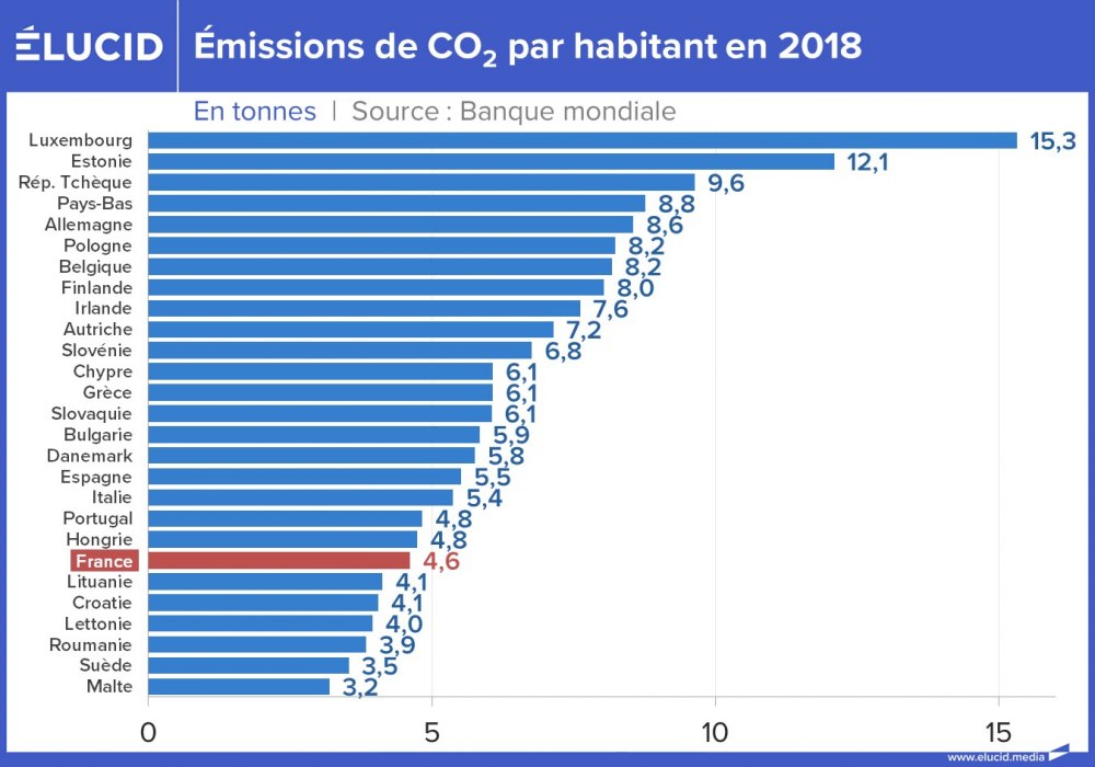 En conséquence de quoi, la France est classée parmi les pays européens émettant le moins de CO2 par habitant ; environ 4,6 tonnes de CO2 par habitant en France en 2018 contre 8,6 tonnes en Allemagne. Aujourd'hui, le choix de cette technologie (avec les défauts et risques qu'elle comporte) fait débat au sein de la société française, et il faudra que la France tranche rapidement au moment où ses centrales arrivent en fin de vie.