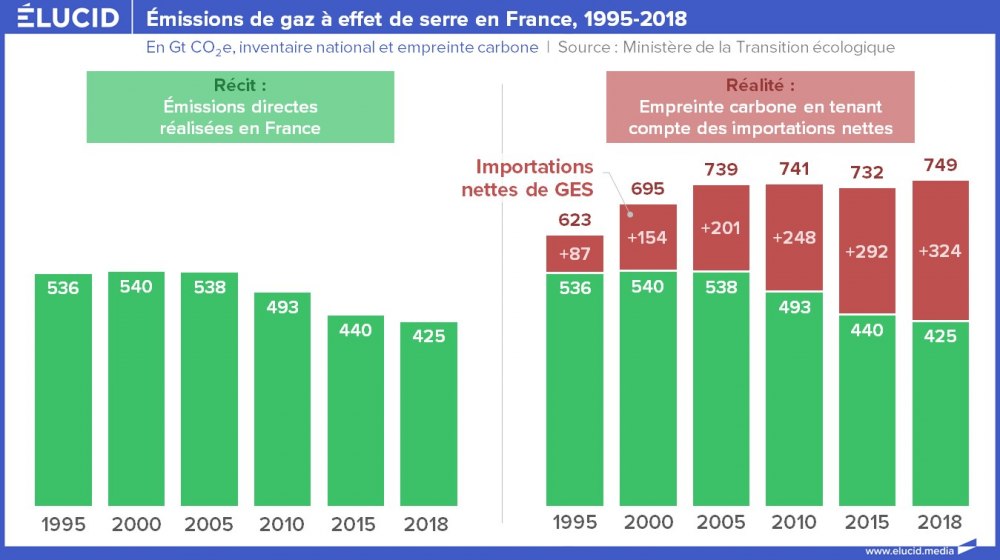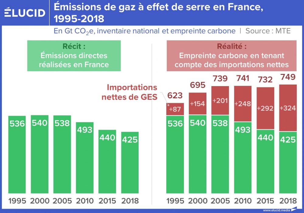 Si l'on réintègre dans le bilan français les émissions de GES qui ont été émises pour fabriquer et transporter les productions délocalisées jusqu’en France, alors le bilan carbone de notre pays présente un visage beaucoup moins ravissant. En effet, la forte baisse des émissions de GES constatées depuis 2000 se retrouve totalement annulée par ces émissions carbone indirectes liées à nos importations.