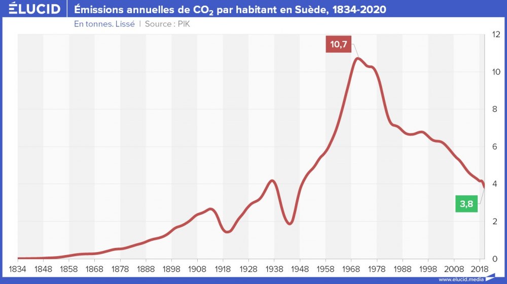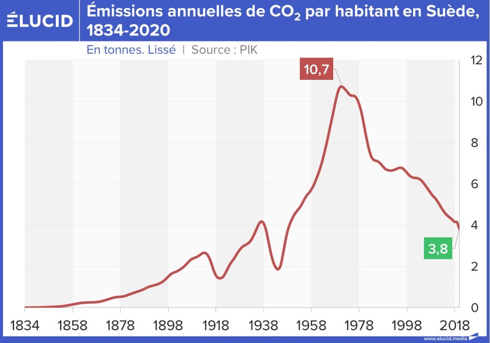 La Suède est le pays qui a le plus tôt mis en place une taxe carbone. Dès 1991, ce pays a introduit une taxe sur l’utilisation des combustibles fossiles (dont les carburants automobiles) au prix de 24 euros la tonne de CO2 émise. Cette taxe a progressé au cours du temps pour atteindre 116 euros par tonne en 2020. L’augmentation du coût des énergies carbonées a conduit à davantage de sobriété énergétique en Suède, avec une baisse d’un tiers des émissions de CO2 depuis 1991.