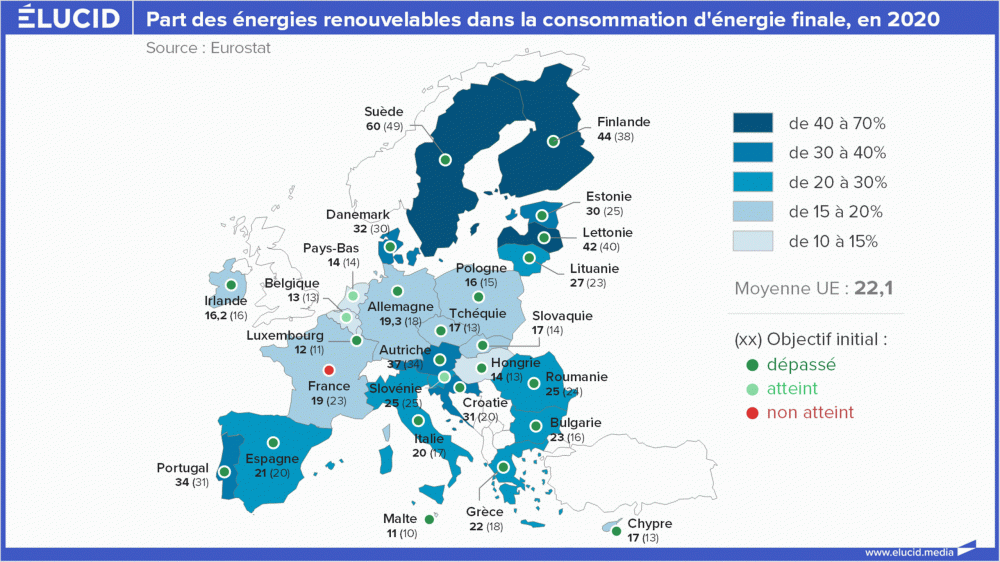 Ce recul s’explique par le manque d’ambition de la France en matière de développement des énergies renouvelables. La France est ainsi le seul pays de l’Union européenne à ne pas avoir atteint ses objectifs de déploiement des énergies renouvelables fixés par une directive européenne de 2009 (les pays avec peu de renouvelables en 2005 ont des objectifs plus faibles que la France, afin de rendre leurs efforts d’installation réalisables).