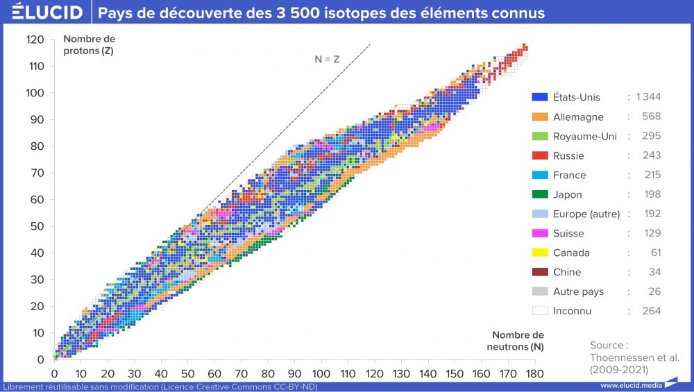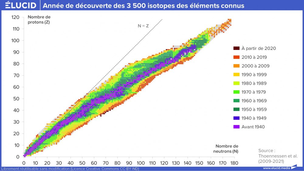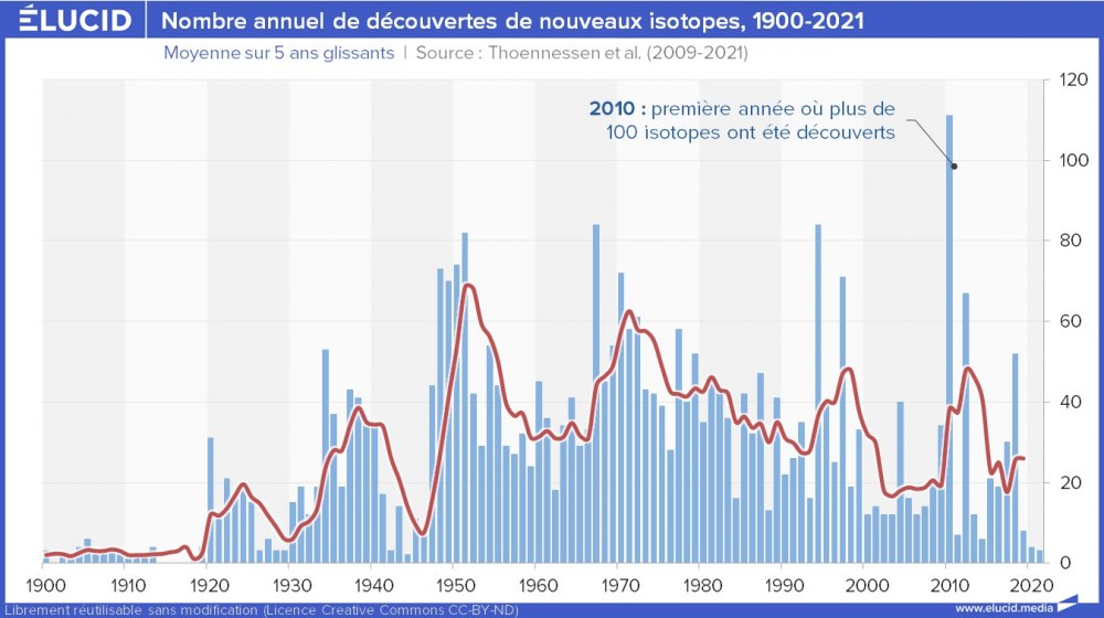 Cette rapidité de découverte a été encore plus grande pour les isotopes des éléments connus, puisque 80 % de ces ceux-ci ont été découverts au cours des trois derniers quarts de siècle. Ceci s’explique par le fait que leur découverte nécessite de lourds moyens technologiques.