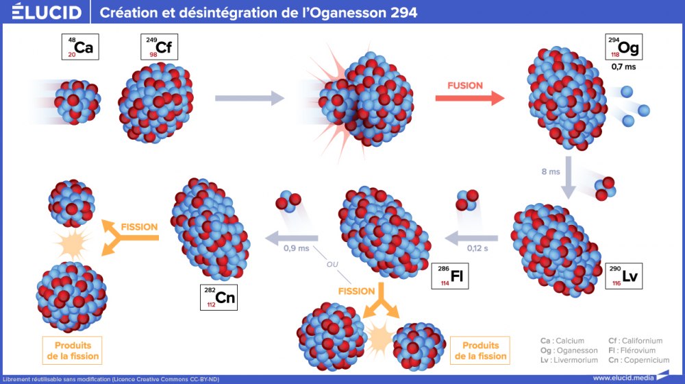 Mais en réalité, cet élément pas vraiment été « découvert ». Comme tous les atomes superlourds, il a été synthétisé. La méthode est assez simple, au moins en théorie : il suffit d’accélérer un atome dans un gigantesque accélérateur de particules, appelé cyclotron, et de le faire collisionner avec un autre atome, suffisamment fort pour que la force nucléaire l’emporte sur la répulsion électrostatique, et qu'ils se combinent ainsi pour en un atome plus lourd.