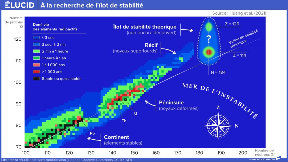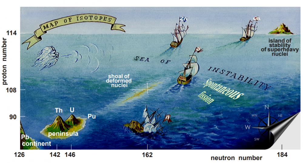 Ces derniers forment ainsi ce que certains appellent la « Péninsule de stabilité », une référence maritime liée à sa représentation sur la carte des noyaux. Dès lors, les physiciens postulent qu’il doit exister un « Îlot de stabilité » dans le voisinage du double nombre magique « Z=114/126 et N=184 », et essayent d’explorer cette zone pour la découvrir.