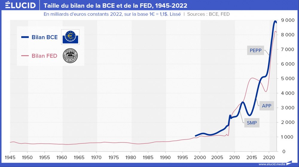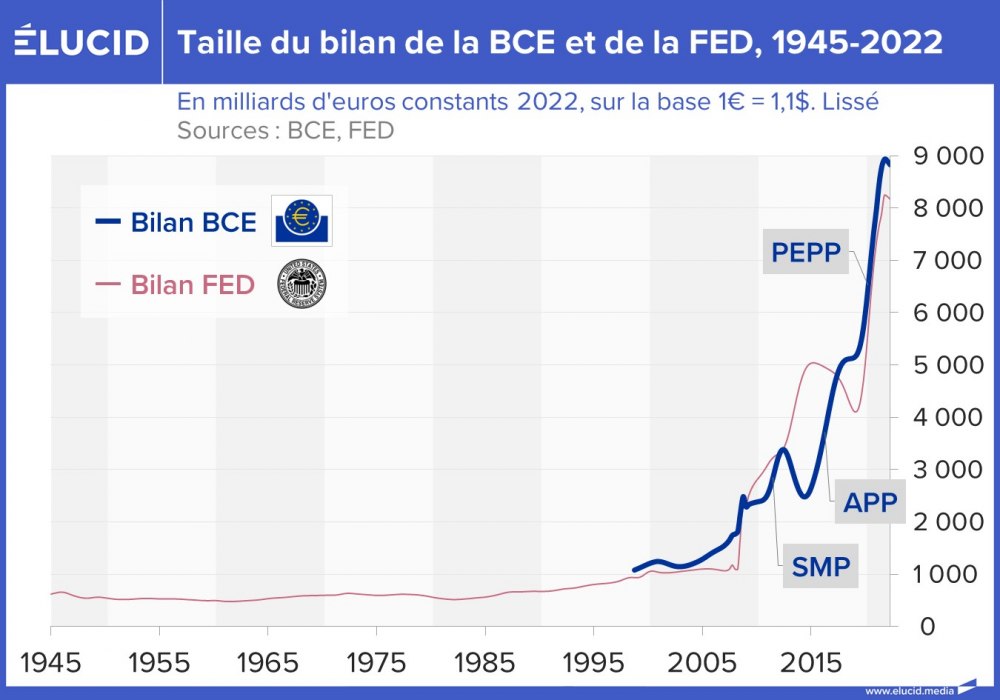 Ces dysfonctionnements monétaires, nommés officiellement « politiques monétaires non conventionnelles », ont été permis grâce à une expansion monétaire historique : les bilans des banques centrales entre 2008 et 2022 ont été multipliés par 7, avec une accélération soutenue de la création monétaire au moment de la crise sanitaire.