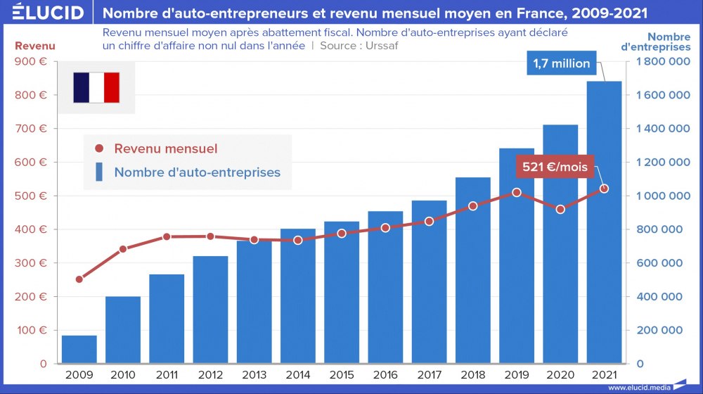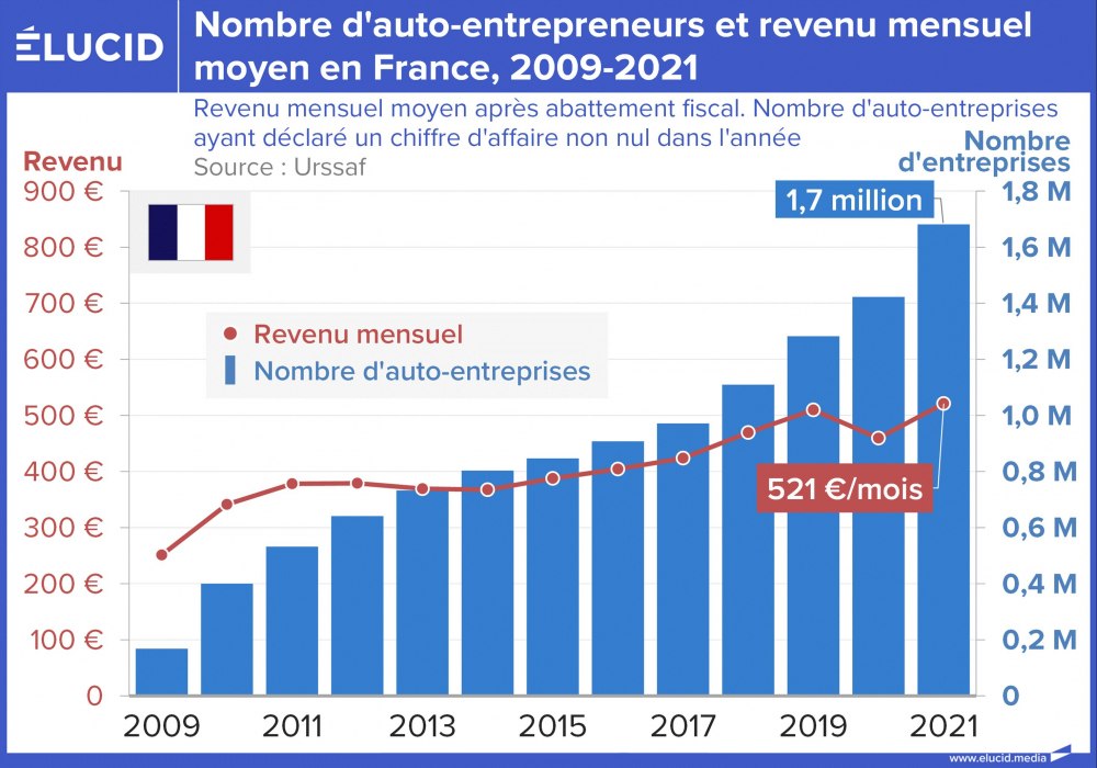 Cette « grande victoire française », selon Bruno Le Maire, repose sur une augmentation des emplois d'autoentrepreneurs aux statuts et revenus fragiles (521 €/mois en moyenne en 2021 selon l’Urssaf – voir graphique ci-dessous) qui contamine le marché du travail en le précarisant massivement à l’image des Uber, Glovo et autres.