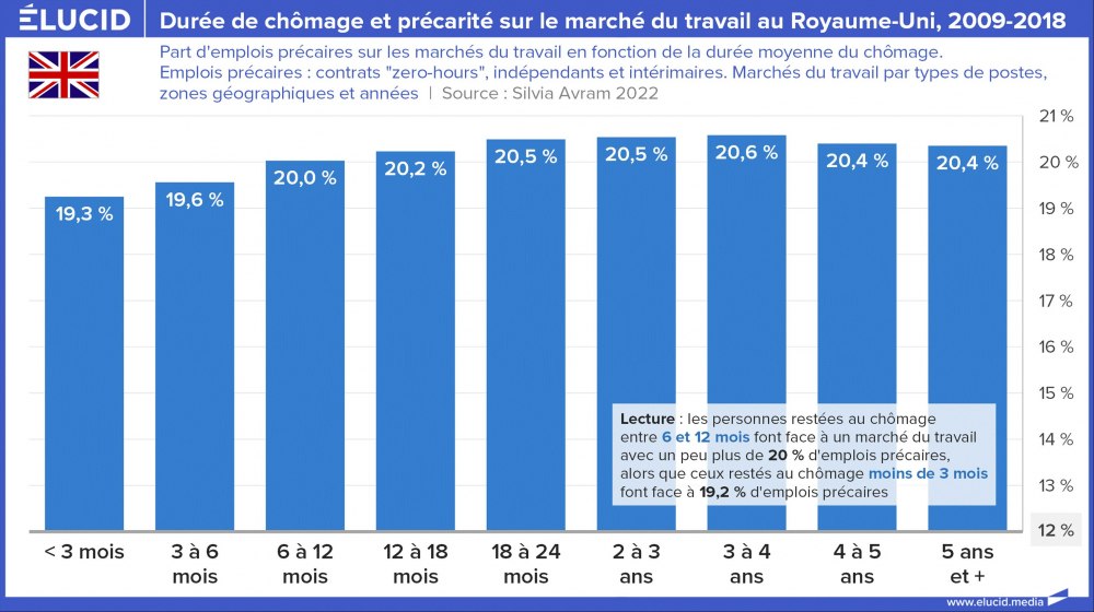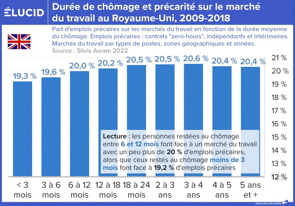 Pour enfoncer le clou, on observe que plus la part d’emplois précaires sur un marché du travail est élevée, plus les durées de chômage sont longues (avec cependant un maximum atteint au bout de quatre années d’inactivité).