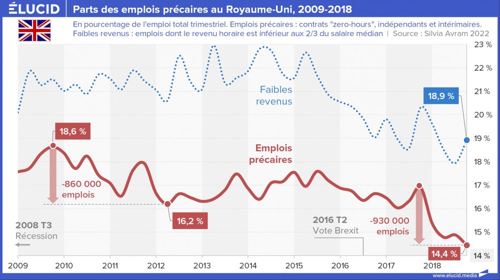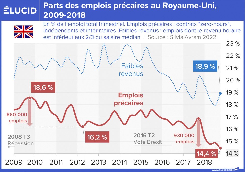 Pire, ces types d’emplois, moins bien rémunérés et occupés par les populations les plus fragiles, sont les premiers à disparaître en cas de crise comme en 2008 ou en 2016 suite au Brexit.