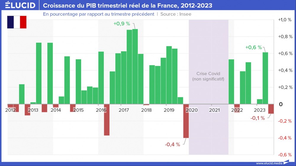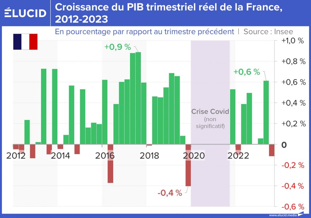 La croissance française s’est effondrée depuis la fin de 2022. Si le 2e trimestre a connu un net redressement, il était en réalité principalement dû à un simple effet temporaire de stockage, et la production française a baissé au 3e trimestre. La forte inflation durant cette période n’a pas eu des effets plus importants en raison des très fortes dépenses engagées par le gouvernement pour soutenir l’économie.