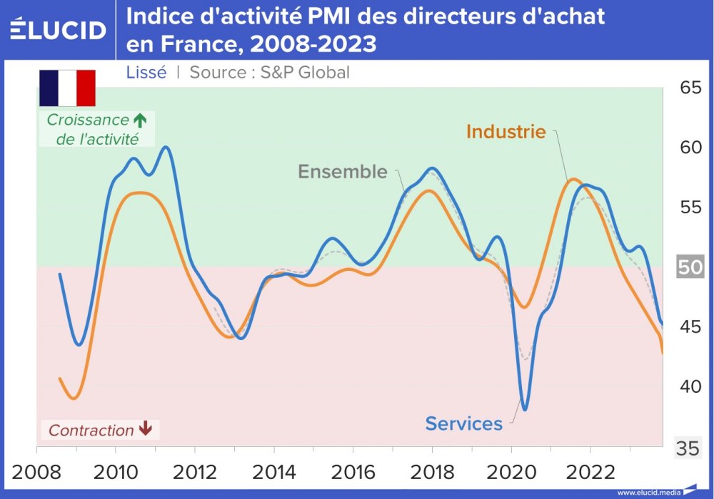 Les indicateurs avancés du moral des ménages, du climat des affaires ou des visions des directeurs d’achat ont atteint fin 2023 des niveaux très bas, généralement corrélés avec des récessions. Les indices industriels sont en particulier très touchés par la crise des prix de l’énergie, et ce en France comme dans le reste du monde.