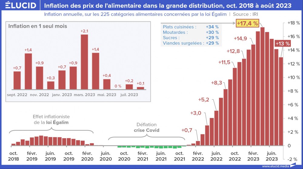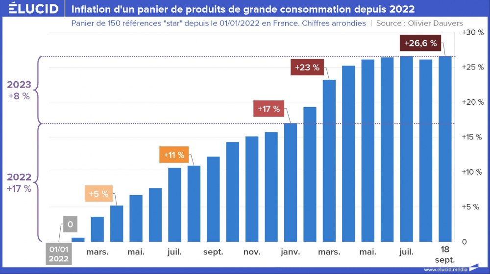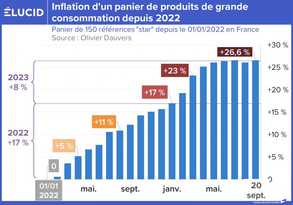 On constate déjà une hausse cumulée du panier de référence de plus de 25 %, et l’inflation de l’alimentaire devrait rebondir au début de 2024 en raison des renégociations tarifaires légales en cours dans la grande distribution.