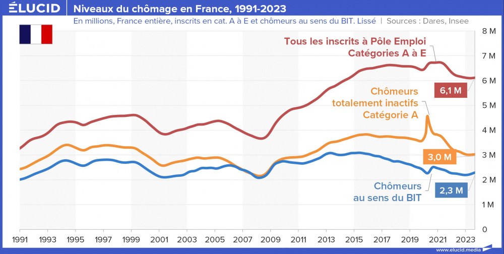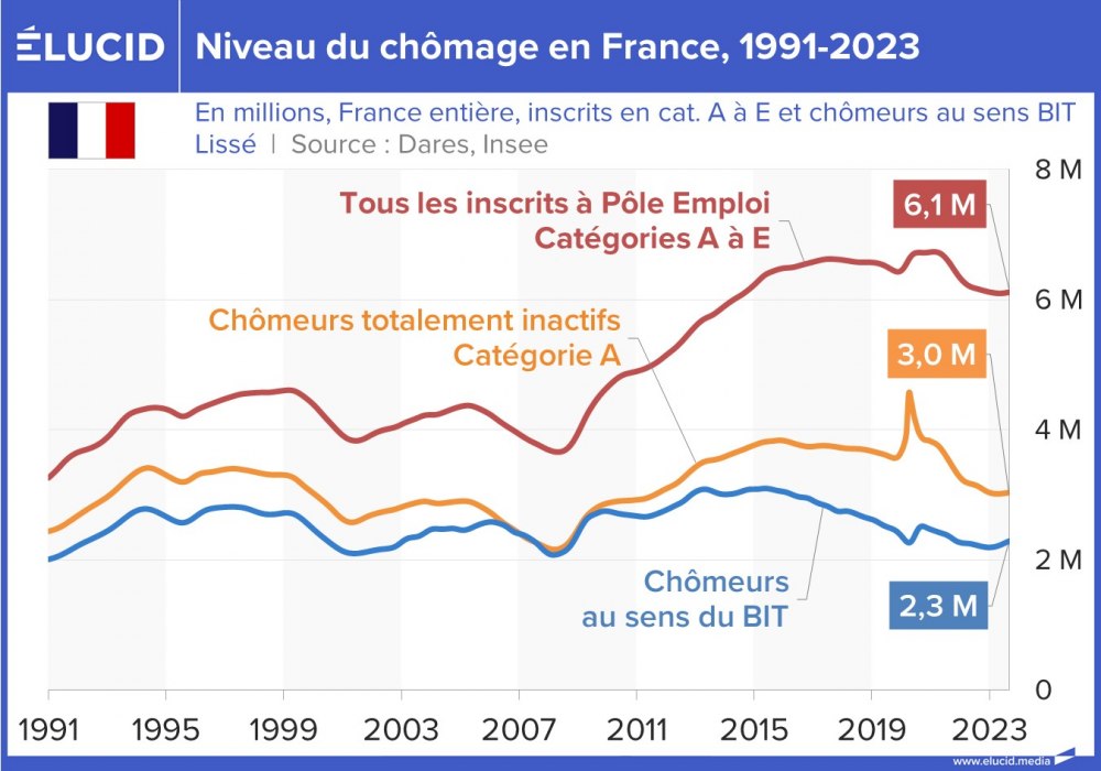 Dans le même temps, les grands médias ne contredisent pas la propagande gouvernementale du « on est proche du plein emploi », et participe ainsi à la fabrique du consentement. La réalité est cependant tout autre : le mouvement s’est inversé fin 2023 et le chômage est reparti à la hausse, ce qui est cohérent avec la dégradation du climat économique.