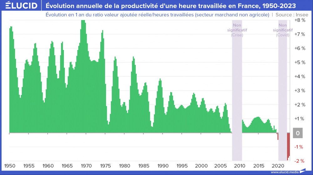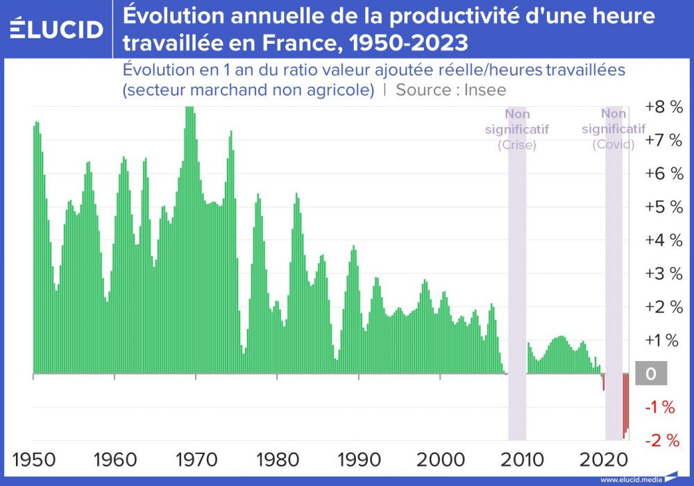 Cette amélioration fictive de l’emploi en France a eu un étrange corolaire depuis quelques années : une baisse historique de la productivité par heure travaillée en France. C’est en réalité logique, car cette baisse a été achetée par le gouvernement à coup de subventions aux emplois aidés (+ 800 000 en 5 ans) et de création de 400 000 emplois non-salariés souvent précaires, voire misérables.