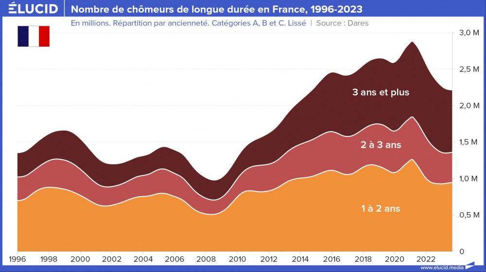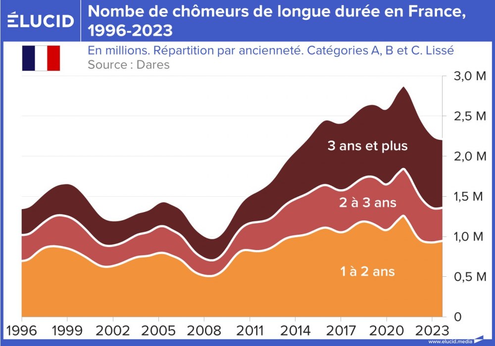 Autre signe de que la baisse du chômage n’était pas liée pour l'essentiel à une amélioration du marché de l’emploi : le chômage de longue durée, qui a explosé depuis 2009, a peu baissé depuis 2020.