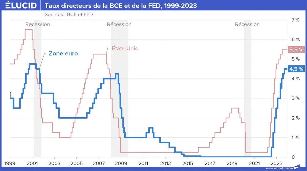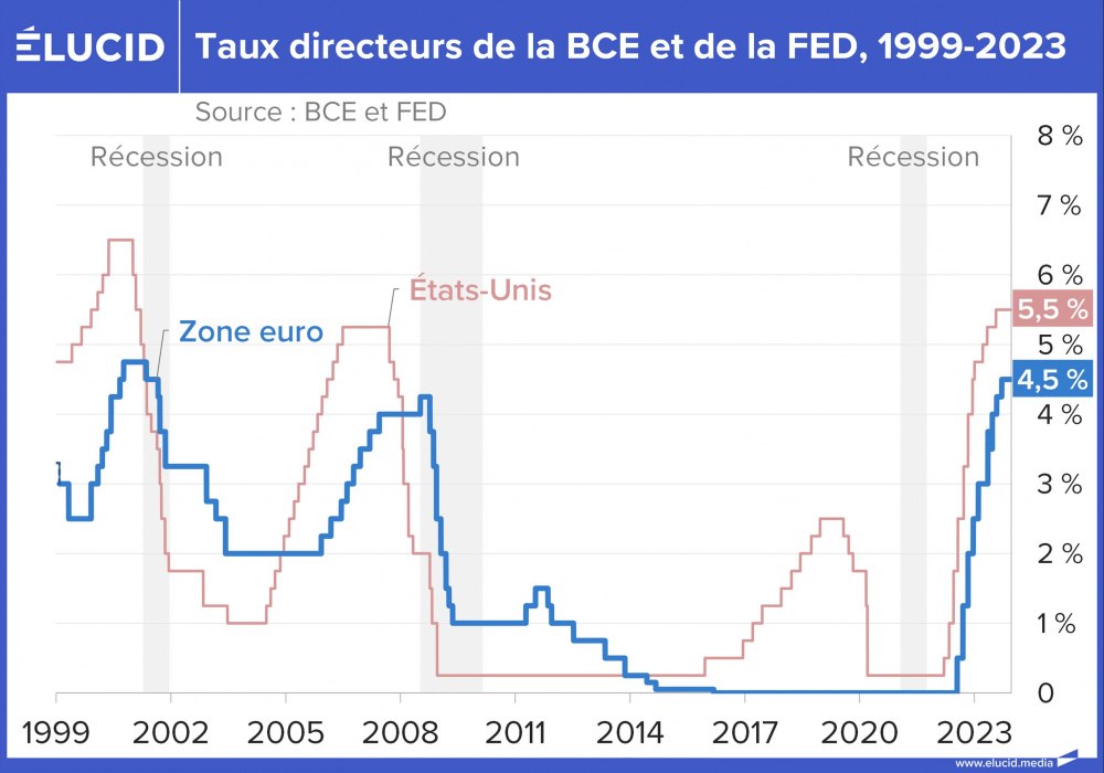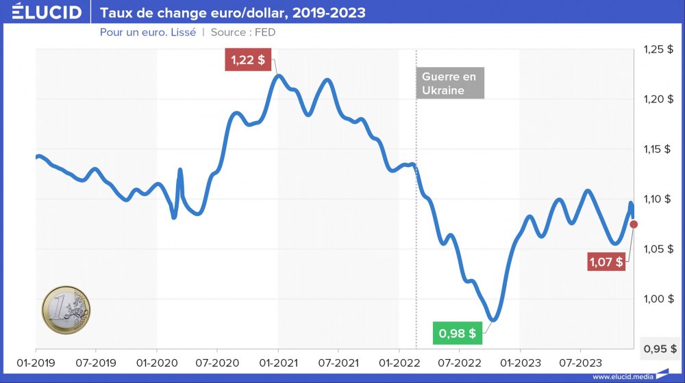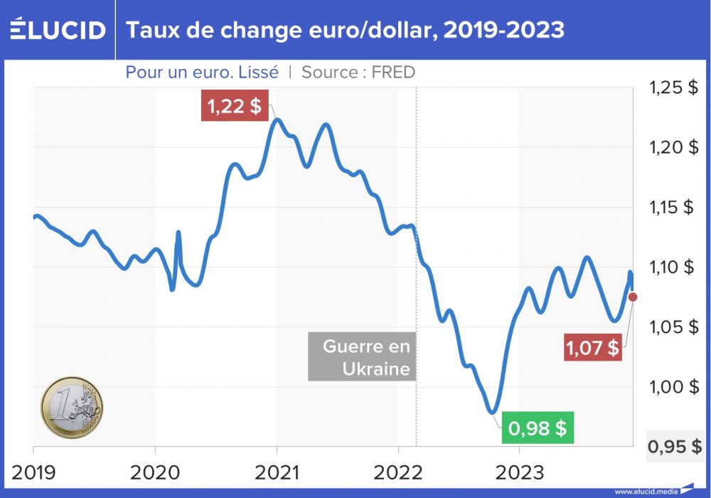 Par ailleurs, la différence entre les taux des deux grandes zones économiques mondiales constitue l'une des raisons de la forte baisse de l’euro, qui est tombé sous la parité avec le dollar mi 2022. Il est un peu remonté depuis, oscillant entre 1,05 et 1,10 du fait de la stabilisation des taux. Cependant, l’euro reste nettement déprécié par les marchés financiers, vu que son « juste » niveau en termes de parité de pouvoir d’achat est d’environ 1,40.