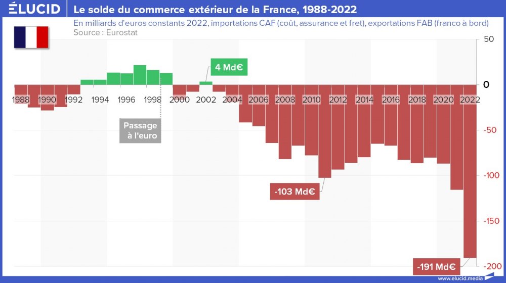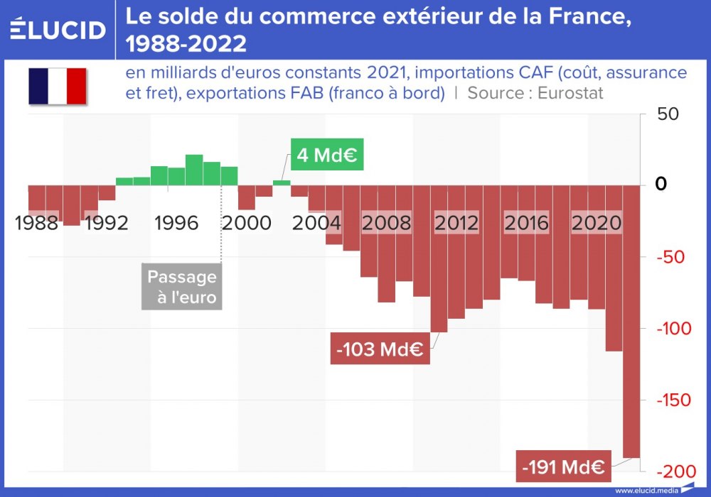 En amplifiant les conséquences de la crise des prix de l’énergie, ce bas niveau de l’euro a eu des conséquences importantes sur notre balance commerciale, dont le déficit de près de 200 milliards d'euros, a battu de très loin son record historique.