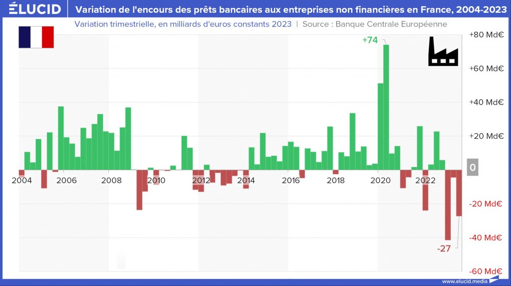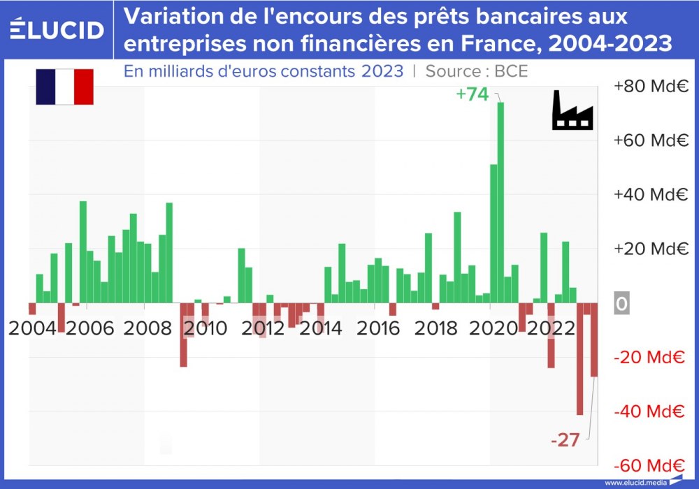 Mais le marché immobilier n’est pas le seul touché par la hausse du coût des crédits. Les entreprises voient aussi leur encours de crédit diminuer, c’est donc autant d’investissements en moins, donc de production en moins, donc d’emplois et de revenus en moins.