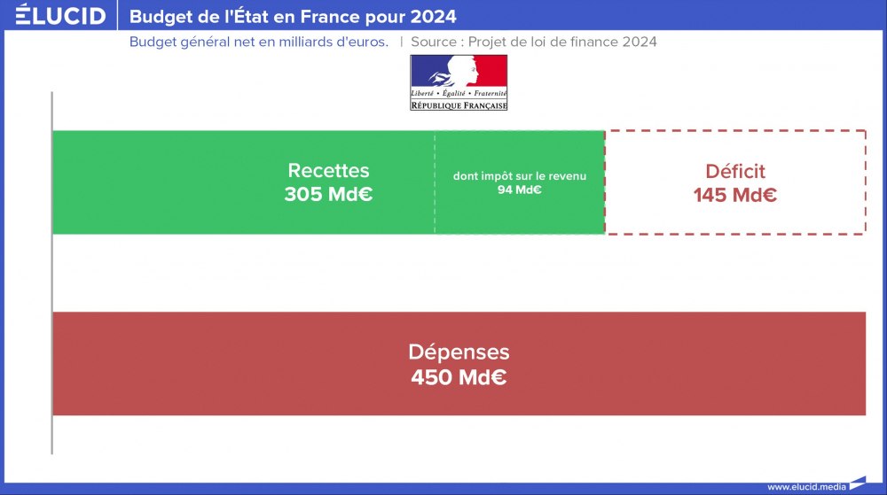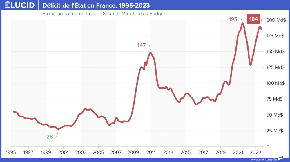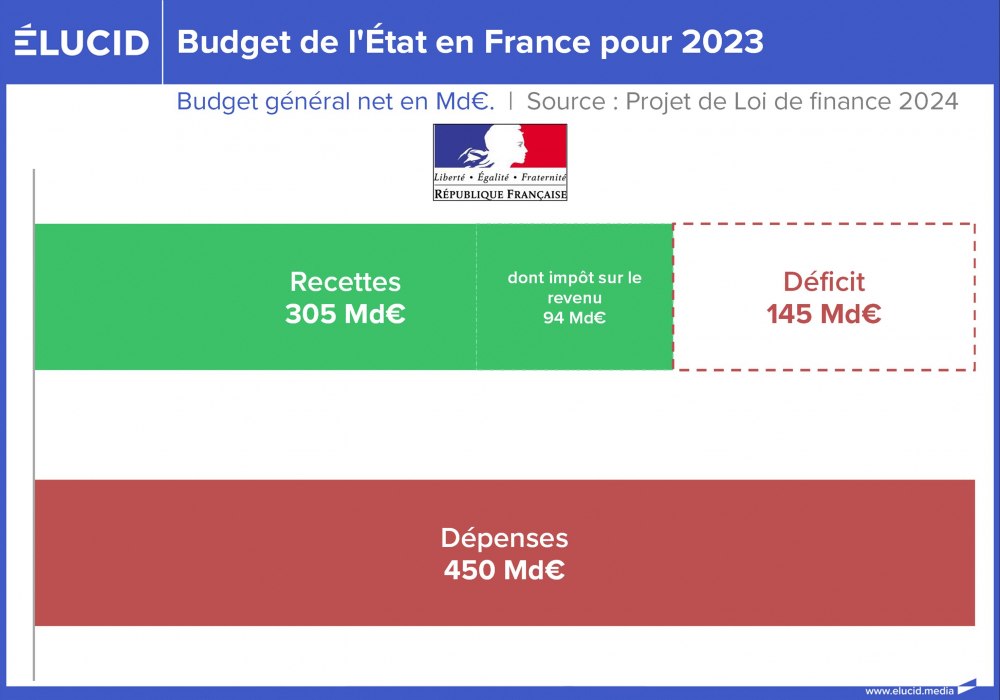Rappelons que la loi de finances pour 2023 annonçait, fin 2022, un déficit pour 2023 à -165 M€. Il a été de -172 Md€ (7 Md€, ça va, ça vient, ce n’est que le double de l’ISF supprimé par Macron après tout...). Le projet de loi de finances pour 2024 l’annonce à -145 Md€. C’est un montant gigantesque mais néanmoins en baisse de 27 Md€, soit 1 % du PIB, ce qui va renforcer les problèmes de croissance en 2024.