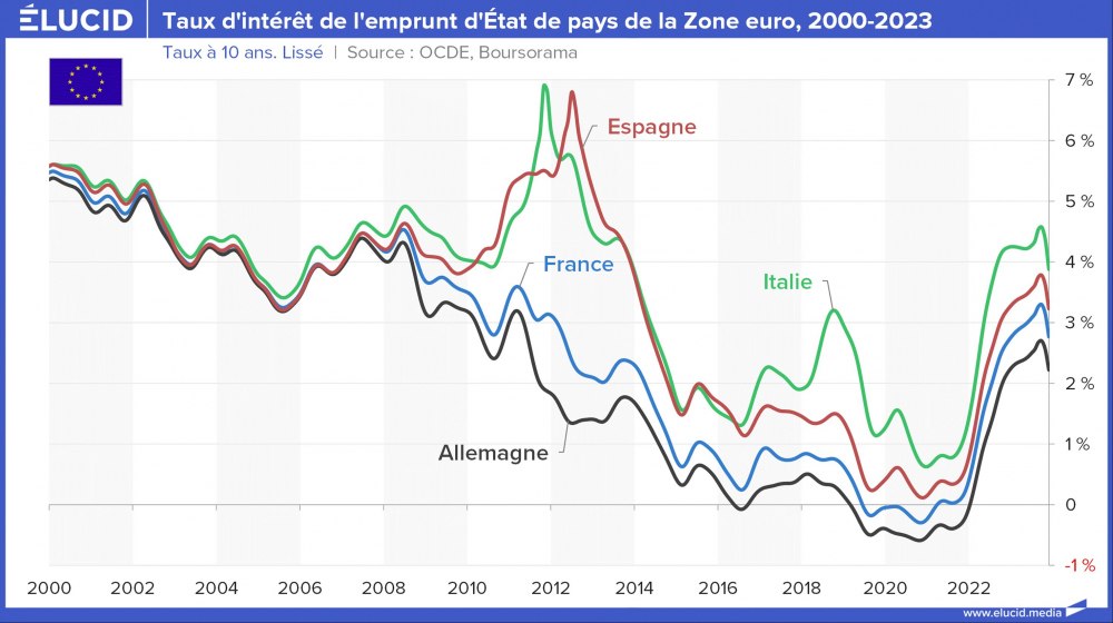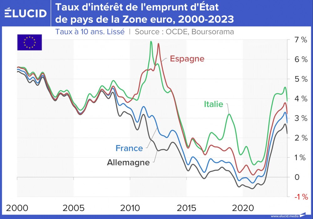 Conséquence de cette gestion calamiteuse et de la remontée des taux par la BCE, les taux d’intérêt payés par l’État restent à des niveaux élevés – 3 % pour les emprunts de l’État français –, après avoir été quasi nuls pendant 8 ans.