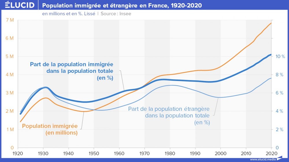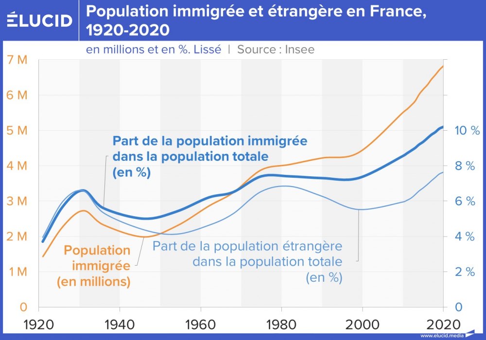 Depuis les années 1950, on constate que la proportion de la population immigrée en France a eu tendance à augmenter, d'abord pendant les Trente Glorieuses, puis depuis le début des années 2000. Alors qu'en 1920, la population immigrée représentait 4 % de la population, elle en représentait 7 % en 1975 et 10 % en 2020.