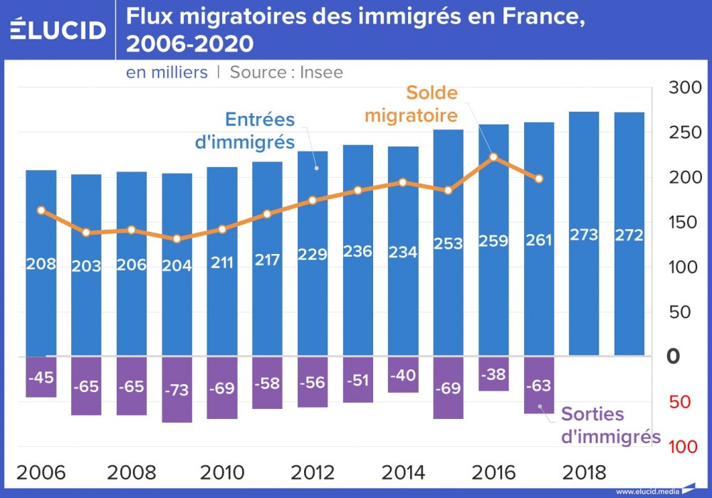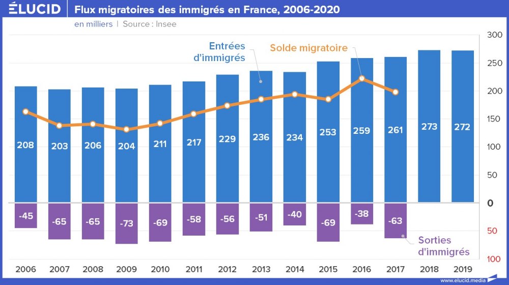 L'accroissement modéré de la population immigrée en France tient au solde migratoire fortement positif. Alors qu’il était d’environ 150 000 personnes par an à la fin des années 2000, il a progressivement augmenté pour représenter environ 200 000 entrées nettes par an à partir de 2014.