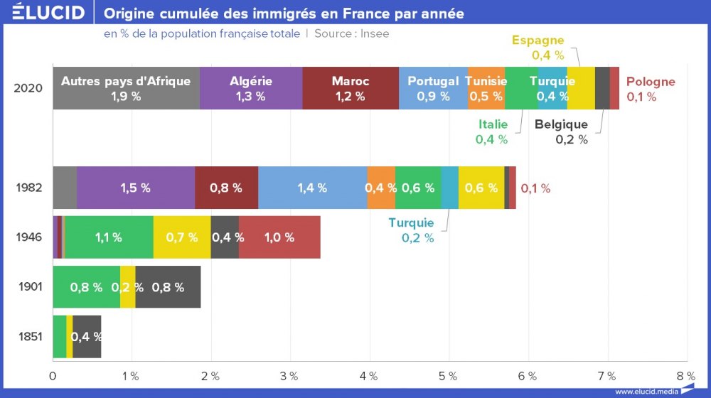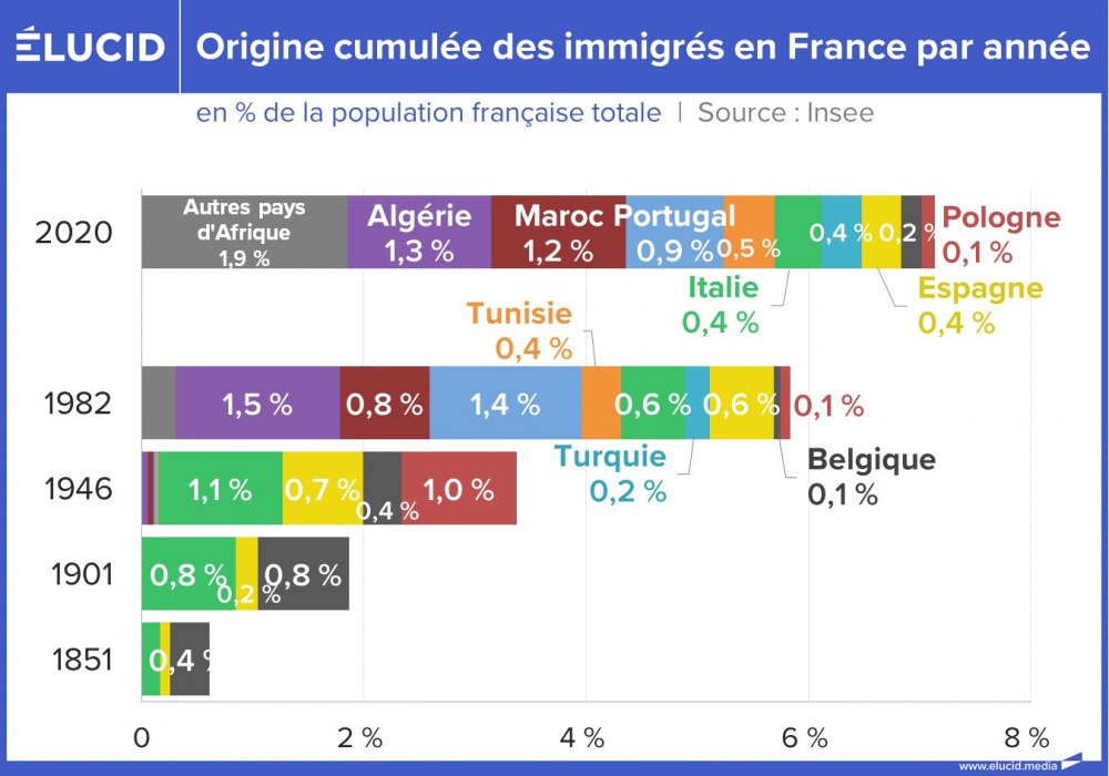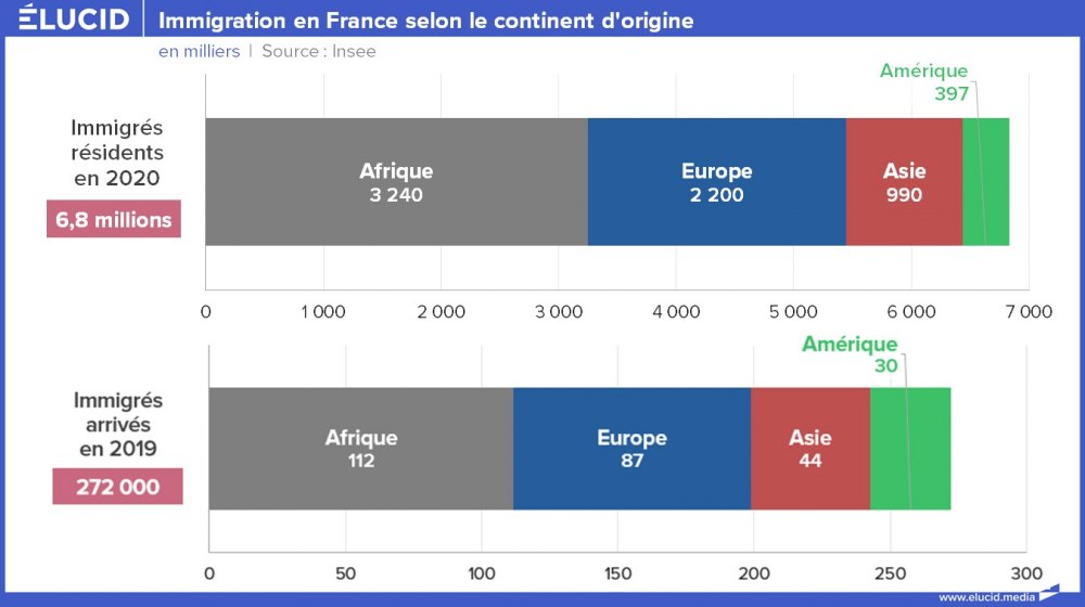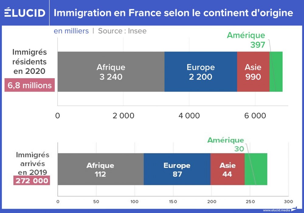 Représentant environ 10 % de la population française, les immigrés français sont pour 1/3 d'origine européenne (principalement du sud de l’Europe) et pour moitié originaires d'Afrique (principalement du Maghreb).