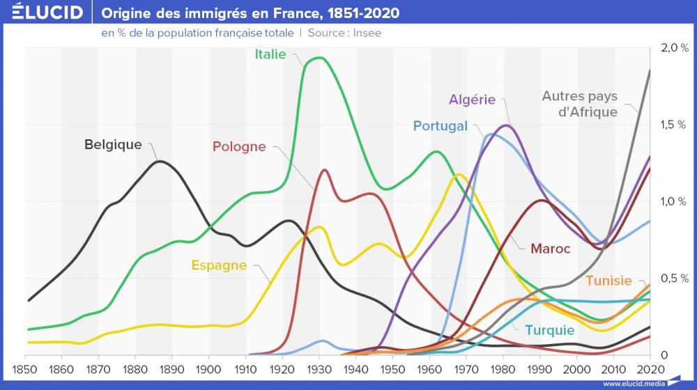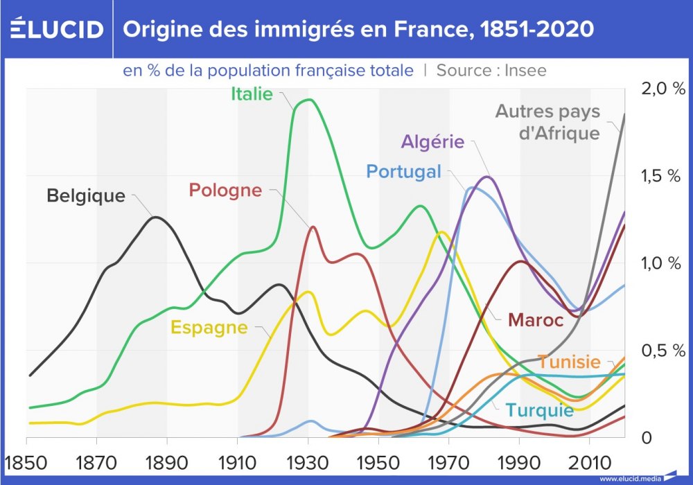 Empiriquement, on observe que les vagues migratoires atteignent un « pic » en termes de part dans la population totale avant de décliner plus ou moins rapidement. Selon toute vraisemblance, la seule vague à ne pas avoir atteint son pic est l'immigration d'origine africaine. En revanche, on constate que malgré une augmentation récente, l’immigration algérienne par exemple n’a pas retrouvé le niveau qu’elle avait atteint en 1980.