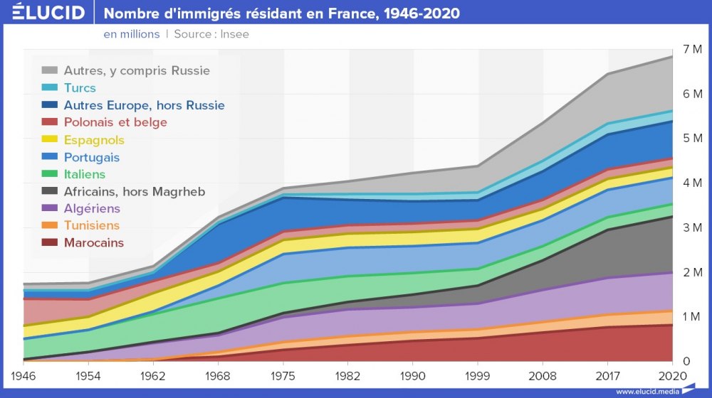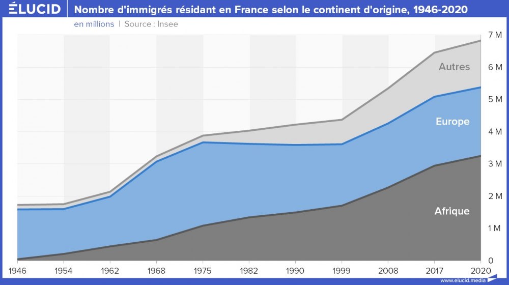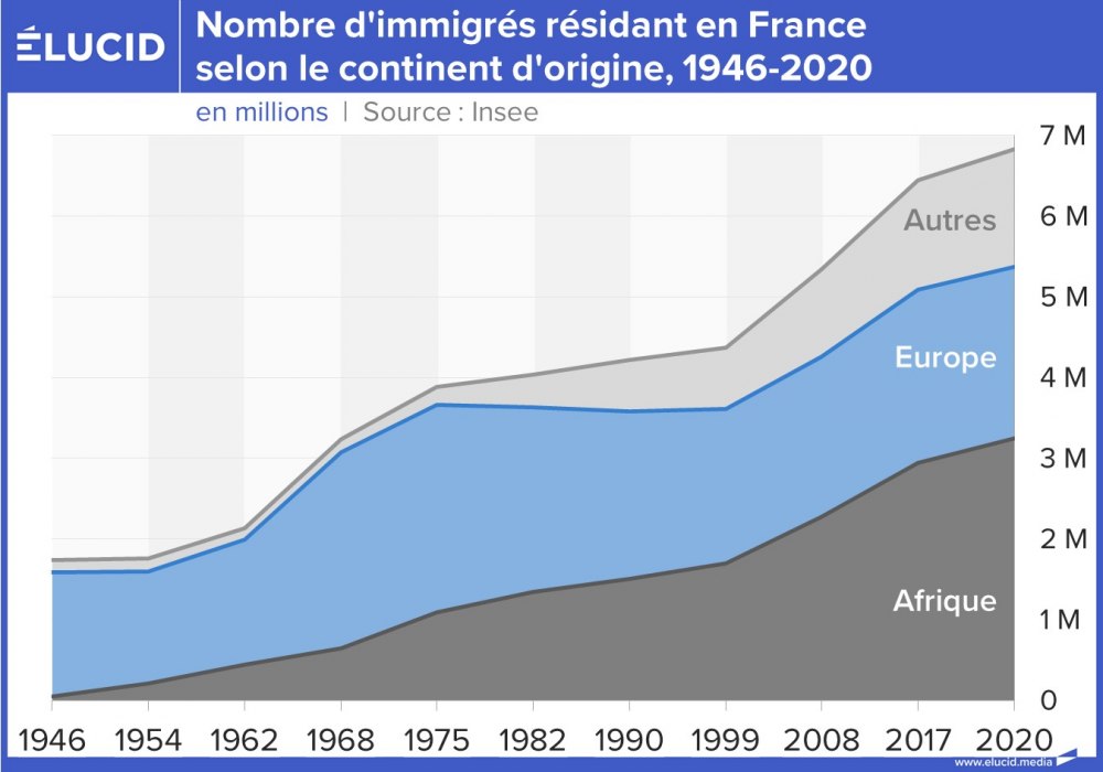 En 2020, sur une population de près de 7 millions d’individus, près de la moitié provenait de pays africains (principalement du Maghreb) et un tiers venait d’un pays européen (principalement du sud de l’Europe). La proportion de la population africaine dans la population immigrée est en nette croissance par rapport aux années 1960 où elle en représentait 20 % du total.