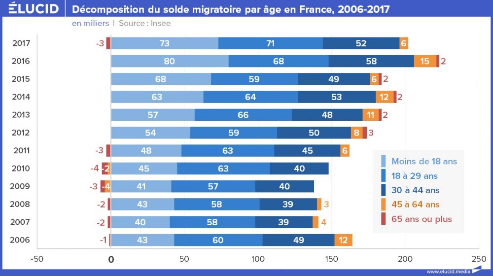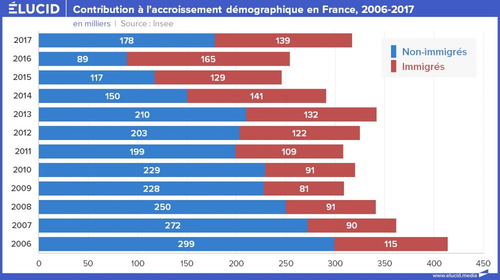 Alors que le solde migratoire contribuait à 25 % de l'augmentation de la population française en 2006, il y contribuait pour près de moitié en 2014. Cette contribution était devenue plus importante que l'accroissement de la population non immigrée en 2015 et 2016.