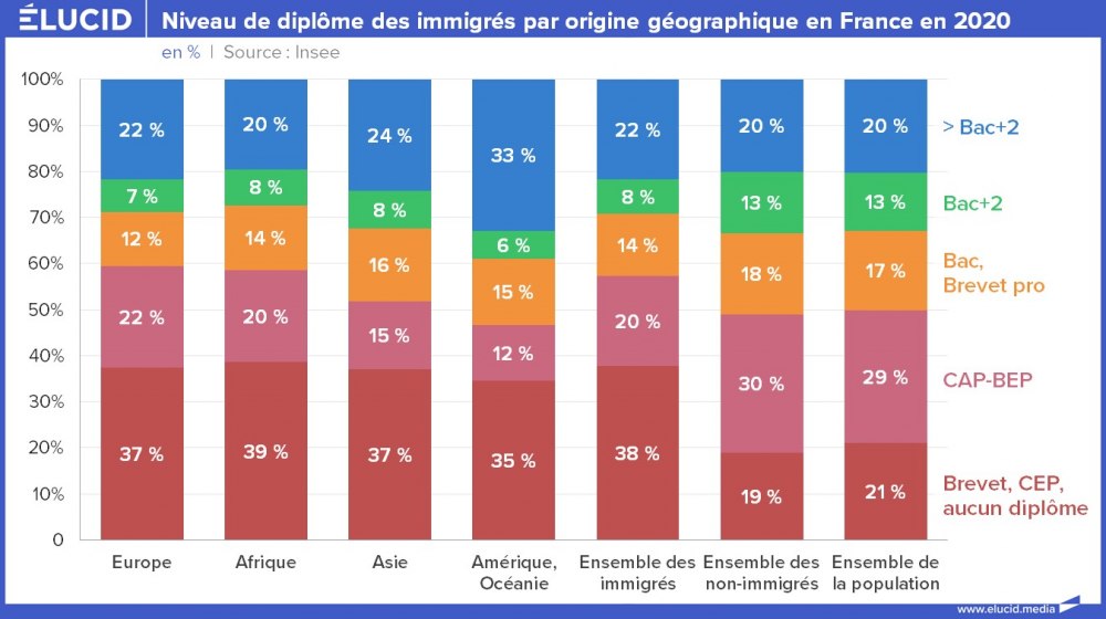 Concernant les niveaux de diplôme, on note que la population immigrée se caractérise par un niveau relativement faible de « qualification intermédiaire ». En effet, la part de la population immigrée bénéficiant d’au moins un diplôme de licence universitaire est supérieure au niveau moyen enregistré dans la population française (20 % en 2020). Cependant, la proportion de la population immigrée présentant un faible niveau d’étude (inférieur ou égal au brevet des collèges) est comprise entre 35 et 38 % suivant les régions d’origine quand elle n’est que de 19 % dans la population française.