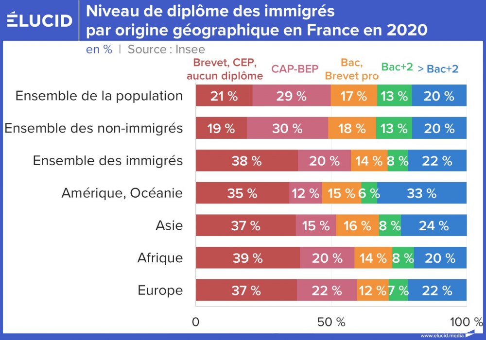 Cette distribution très « inégalitaire » des ressources éducatives au sein de la population immigrée est à rapprocher du fait que plus d’un tiers des immigrés arrivant en France ont moins de 18 ans et qu’ils n’ont en conséquence pas pu finir leur parcours scolaire. Cette distribution n’est pas sensible à l’origine géographique des migrants (hors le cas de l’Amérique) : les immigrés d’origines européennes ne sont pas plus diplômés que les immigrés d’origine africaine.