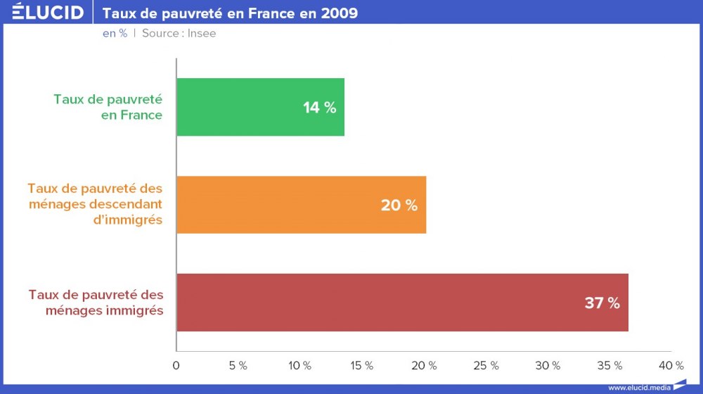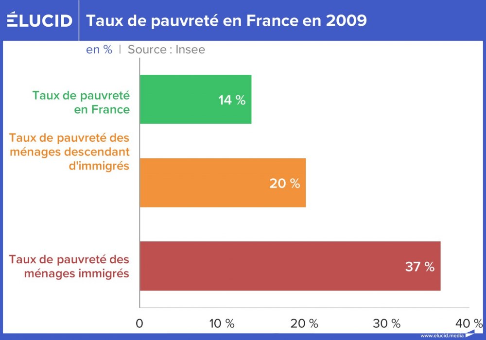 Alors que la pauvreté ne concerne "que" 14 % des ménages français, cette proportion augmente à 37 % pour les ménages immigrés. Pour les personnes vivant dans un ménage descendant d’immigrés, ce chiffre baisse à 20 % de pauvreté, témoignant d’une meilleure insertion au sein de la société française.
