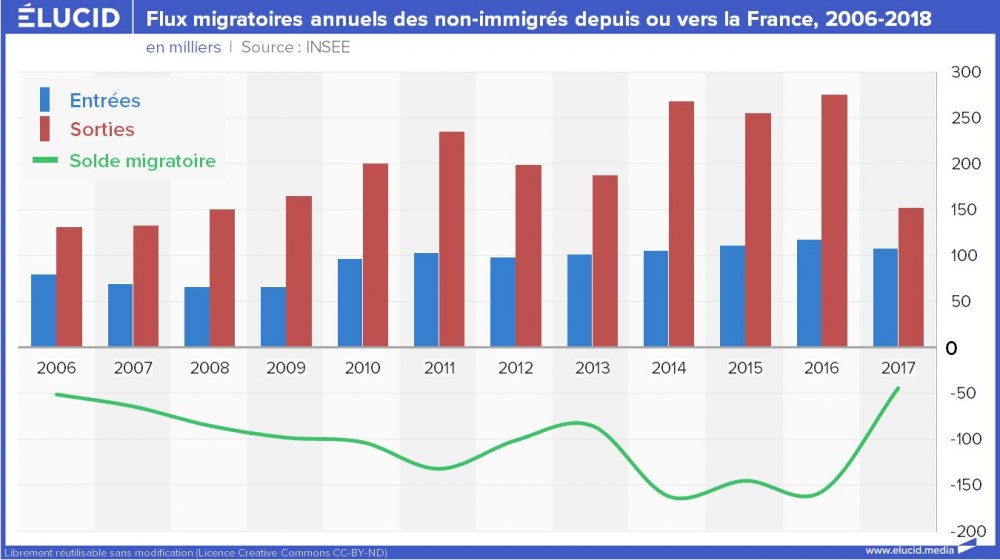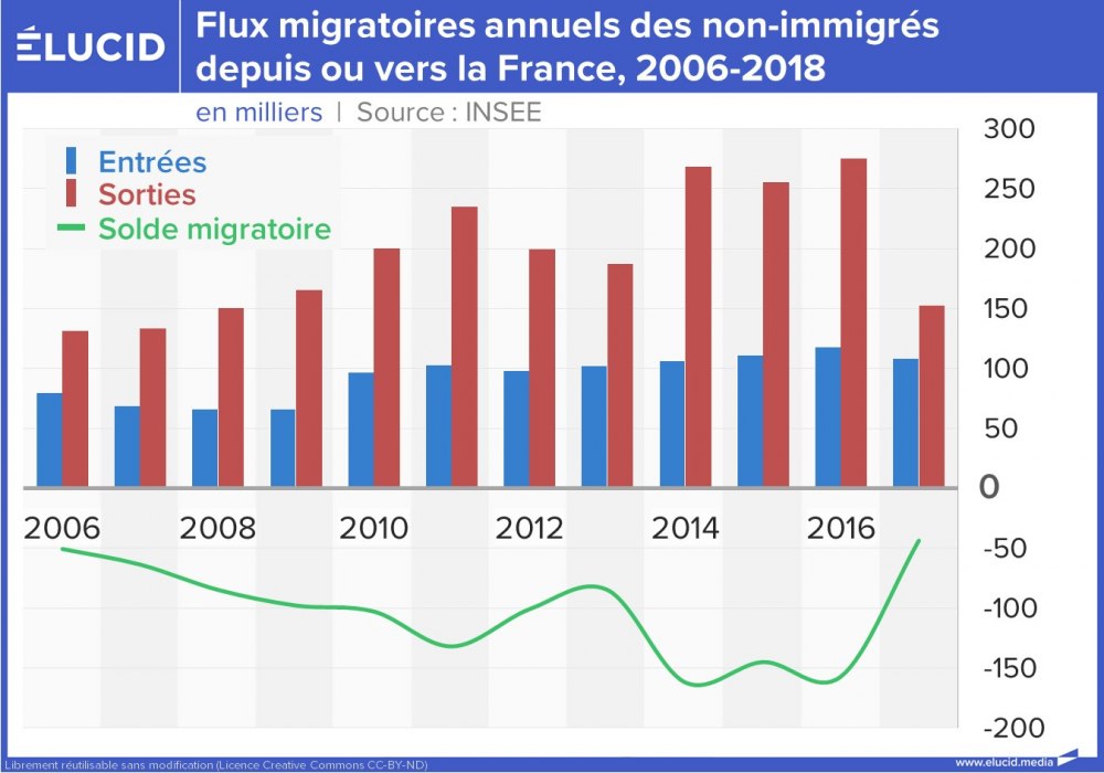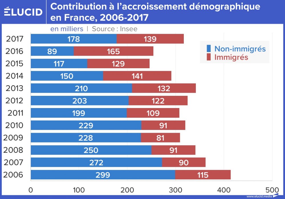 L’année 2017 a cependant marqué un rebond de l’accroissement de la population non immigrée en France, non en raison d’un rebond de l’accroissement naturel, mais en raison d’un plus faible nombre de départs de français à l’étranger (environ 40 000 personnes). Mais ce rebond ne semble pas s’être poursuivi dans les années suivantes.