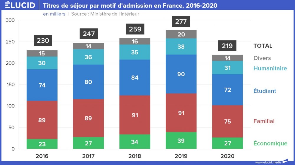 La délivrance de titres de séjours pour motifs familiaux ou d’étude sont les deux plus importantes avec un tiers chacune des 280 000 demandes de titres de séjour accordées en 2019. Les motifs de travail ainsi que les motifs humanitaires représentaient pour chacun 15 % des délivrances de titres de séjours.
