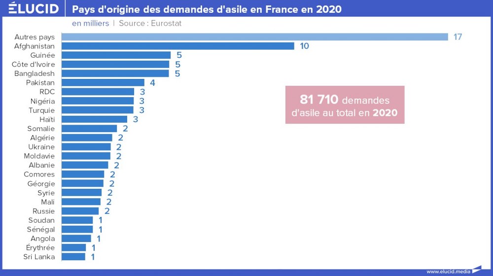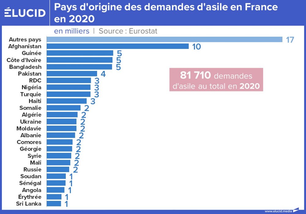 Cependant, la délivrance du droit d’asile ne prend pas en compte l’ensemble des demandes d’asiles formulées auprès de l’OFPRA (Office français de protection des réfugiés et apatrides) et dont la majorité est rejetée par ce même office. Ces demandes s’élevaient à 133 000 en 2019 et 82 000 en 2020. Les nationalités les plus représentées dans ces demandes d’asiles en 2020 étaient l’Afghanistan avec près de 10 000 demandes, et 4 600 demandes pour les ressortissants de la Côte d’Ivoire, de la Guinée et du Bangladesh.