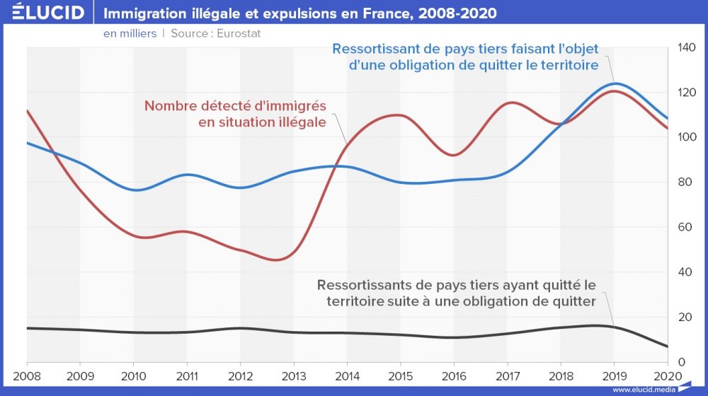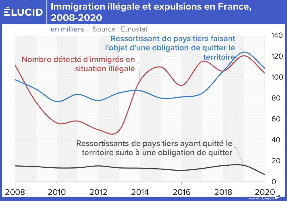 Les étrangers en situation illégale « détectés » en France représentent selon les chiffres d’Eurostat près de 100 000 personnes en 2020. Un nombre important de ces migrants illégaux correspond en fait aux « OQTF » non appliquées par des demandeurs d’asile déboutés par l’OFPRA.