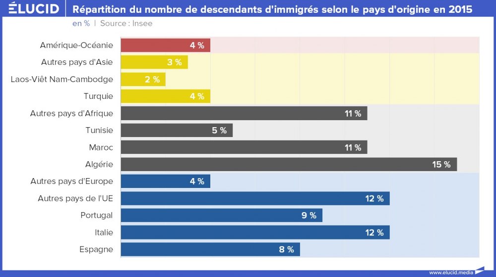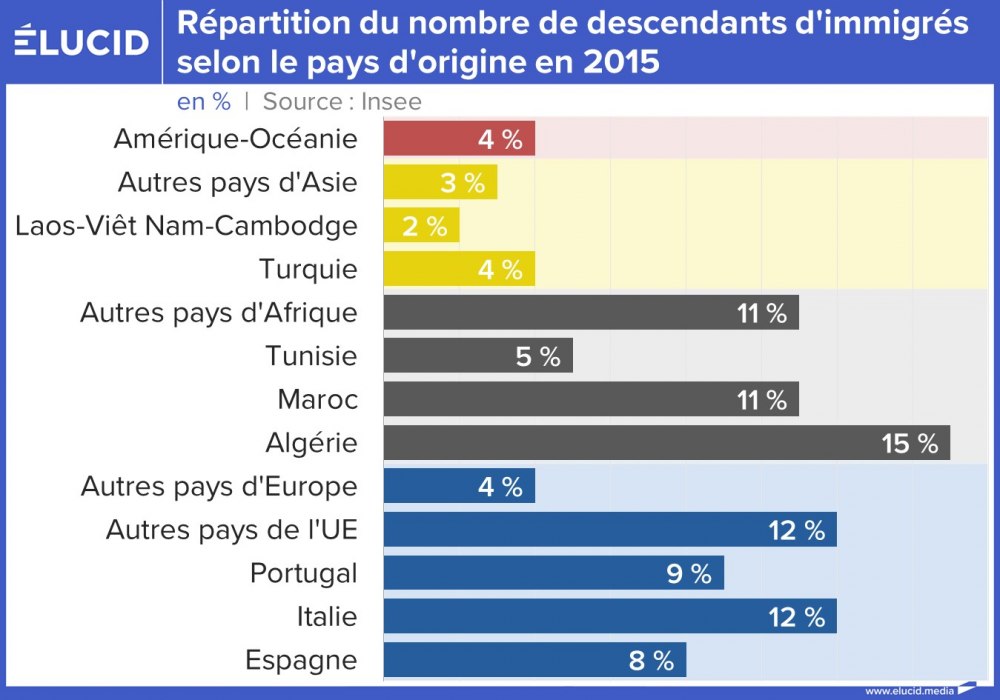 Les Français issus de l’immigration, c’est-à-dire ayant au moins un parent immigré, représentaient 7,3 millions de personnes en 2015, soit 11 % de la population. Parmi eux, 45 % avaient deux parents immigrés. Si on se rapporte à la nationalité du ou des parents immigrés, environ 45 % des descendants d’immigrés sont originaires d’un pays européen et 42 % d’un pays africain. En raison des vagues migratoires plus récentes venues d’Afrique, les descendants d’immigrés africains sont en général plus jeunes que les descendants d’immigrés européens.