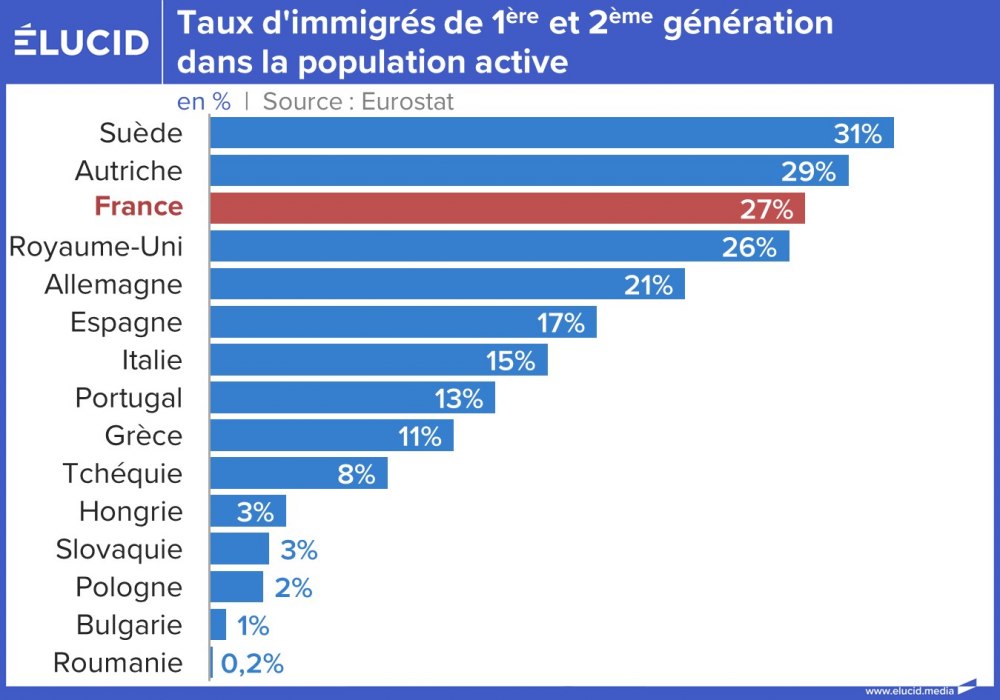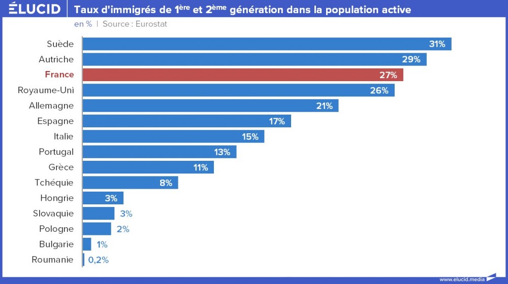 En utilisant les données d’Eurostat, le cumul des générations d’immigrés et de leurs descendants représente près de 27 % de la tranche d'âge des 15-64 ans, un des taux les plus élevés de l’Union européenne après l’Autriche et la Suède.