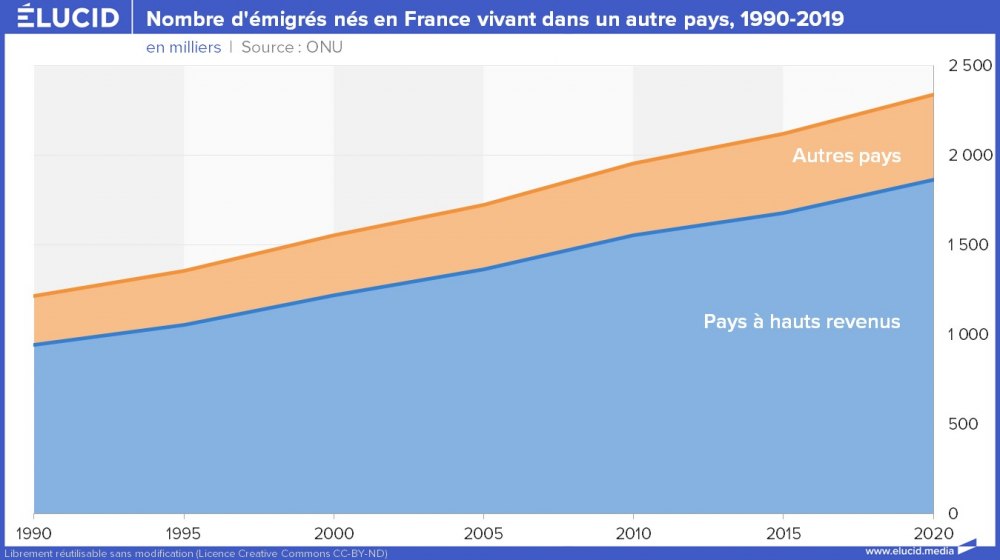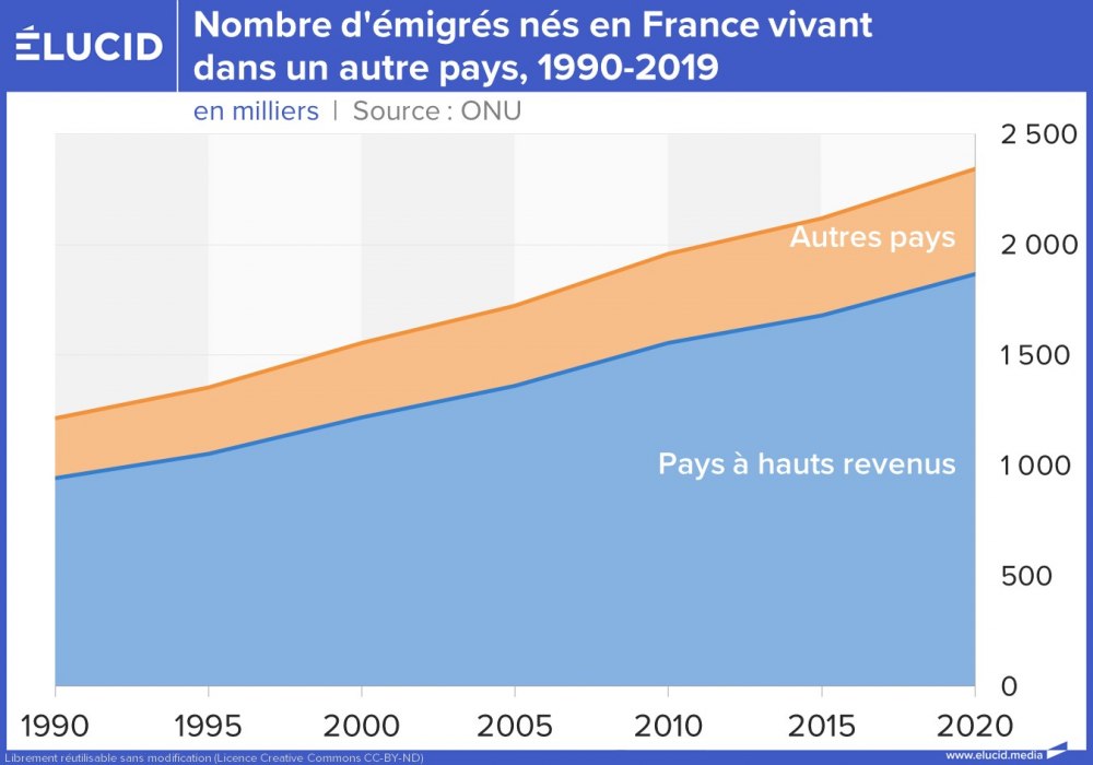 En 2020, ce sont au total près de 2,4 millions de Français qui vivent à l’étranger. L’écrasante majorité (1,9 million) se localise dans des pays « à hauts revenus » contre 500 000 dans des pays en développement.