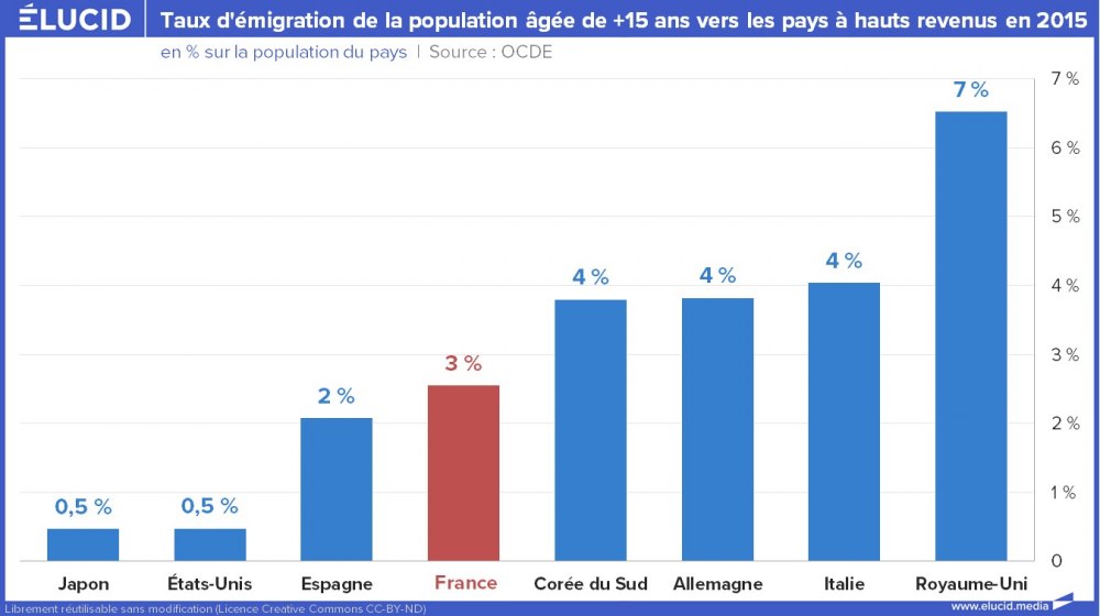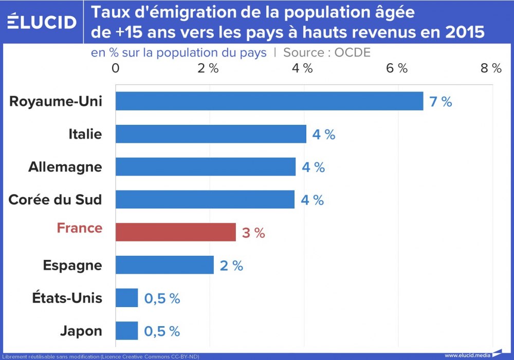 Si ce phénomène d’émigration devient de plus en plus préoccupant, il faut relever que la France n’est pas le pays développé le plus touché par le phénomène de fuite des cerveaux. En effet, alors qu’environ 3 % des actifs français ont émigré à l’étranger, ce taux grimpe à près de 4 % en Corée du Sud, en Allemagne et en Italie. Le champion toutes catégories reste le Royaume-Uni, avec 6,5 % de sa population active résidant à l’étranger. Par contraste, les États-Unis ou le Japon ont un taux d’émigration extrêmement faible d’environ 0,5 % chacun.