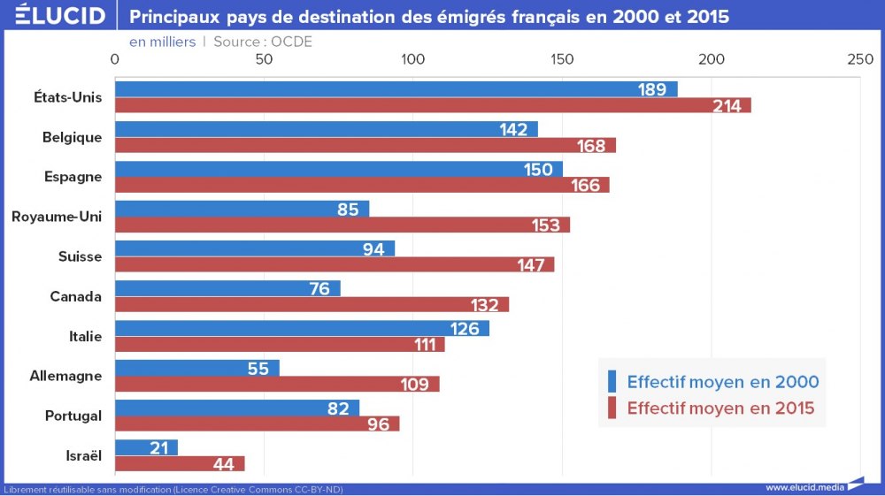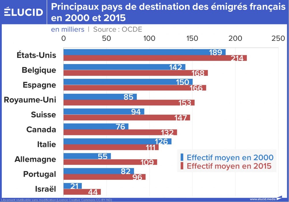 Si l'on détaille par pays de destination en 2015, on constate que les États-Unis caracolent en tête du classement avec près de 214 000 Français résidant dans ce pays. Les pays européens frontaliers de la France ne sont pas en reste puisqu’on retrouve la Belgique, l’Espagne, le Royaume-Uni et la Suisse en tête des destinations d’expatriation favorite. Aucun pays à « faible revenu » n’apparaît dans ce classement.