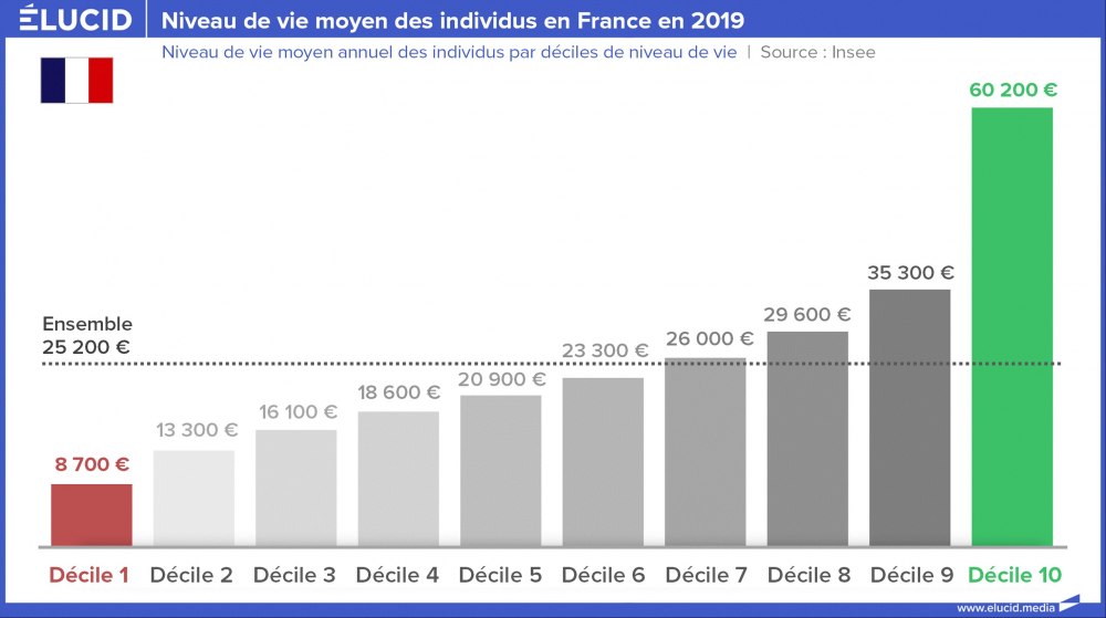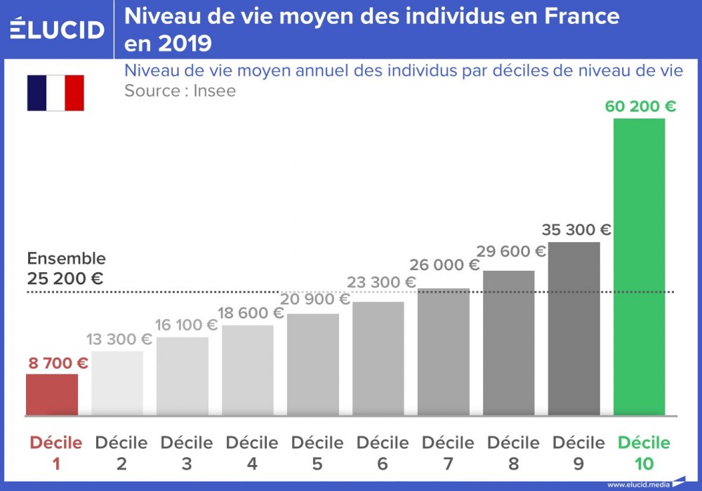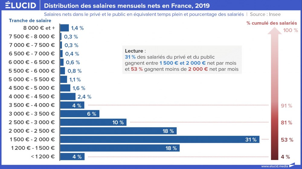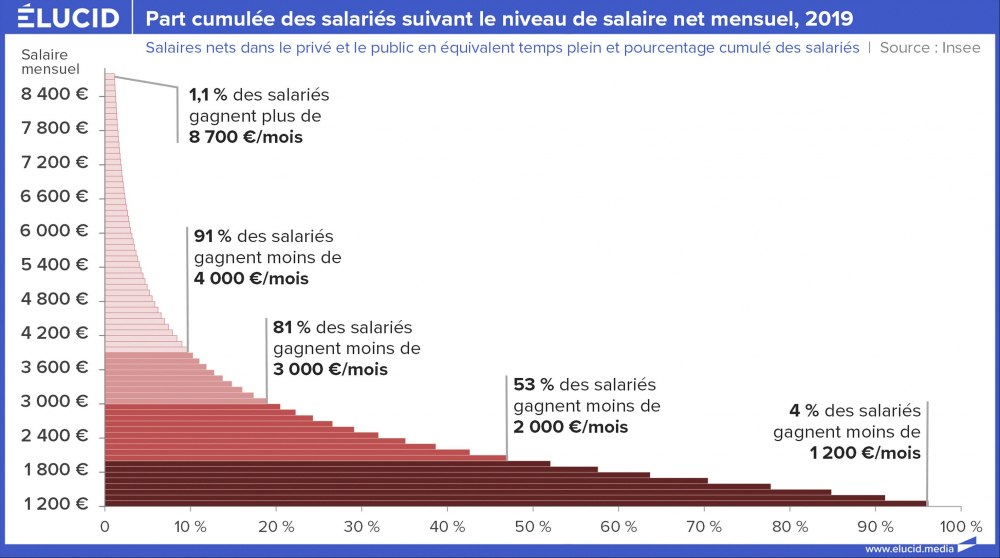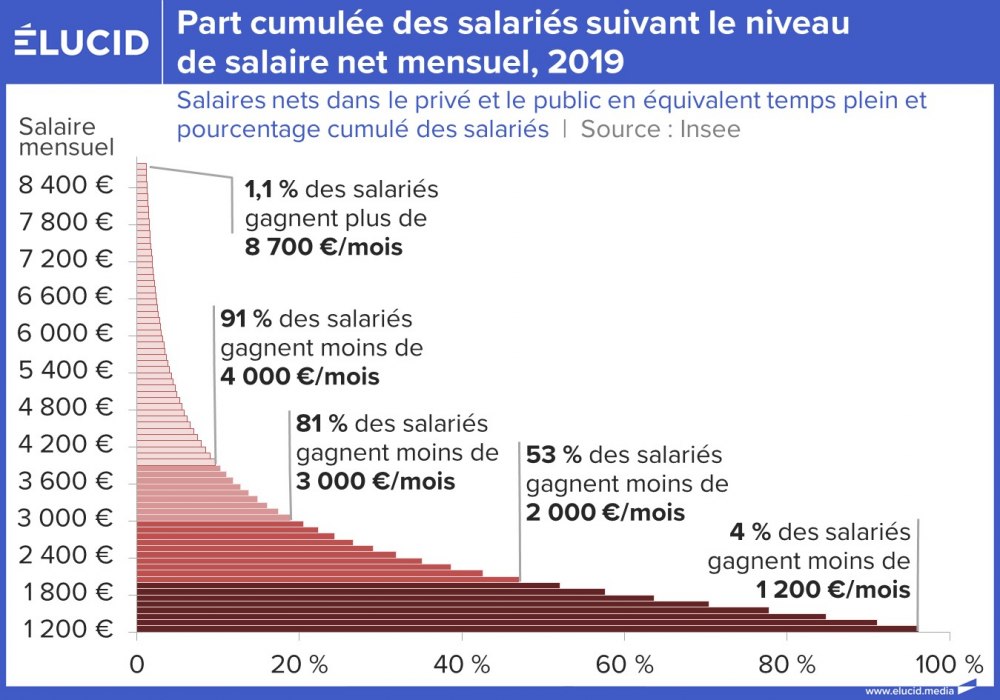 Ainsi, en France, 50 % des salariés disposent de moins de 2 000 € net/mois, tandis que 80 % d’entre eux disposent de moins de 3 000 € net/mois. À l'autre bout de l’échelle, 1,4 % des salariés affichent un salaire supérieur à 8 000 € net mensuel.