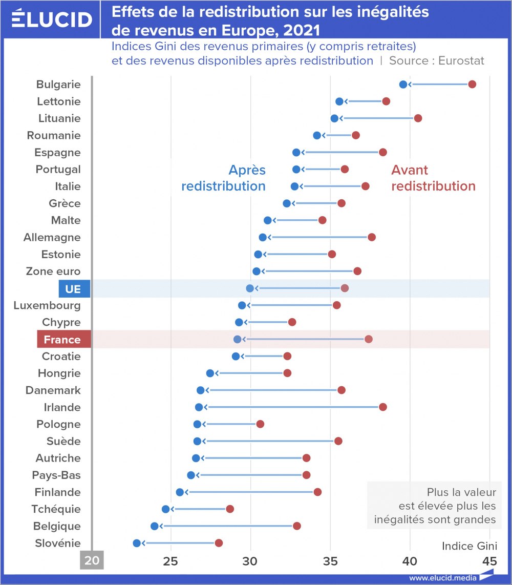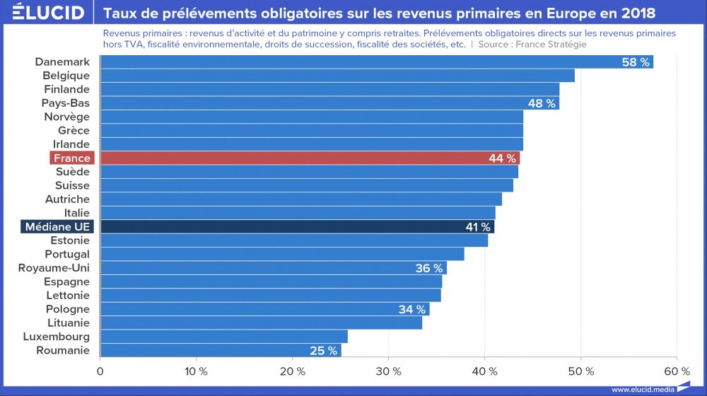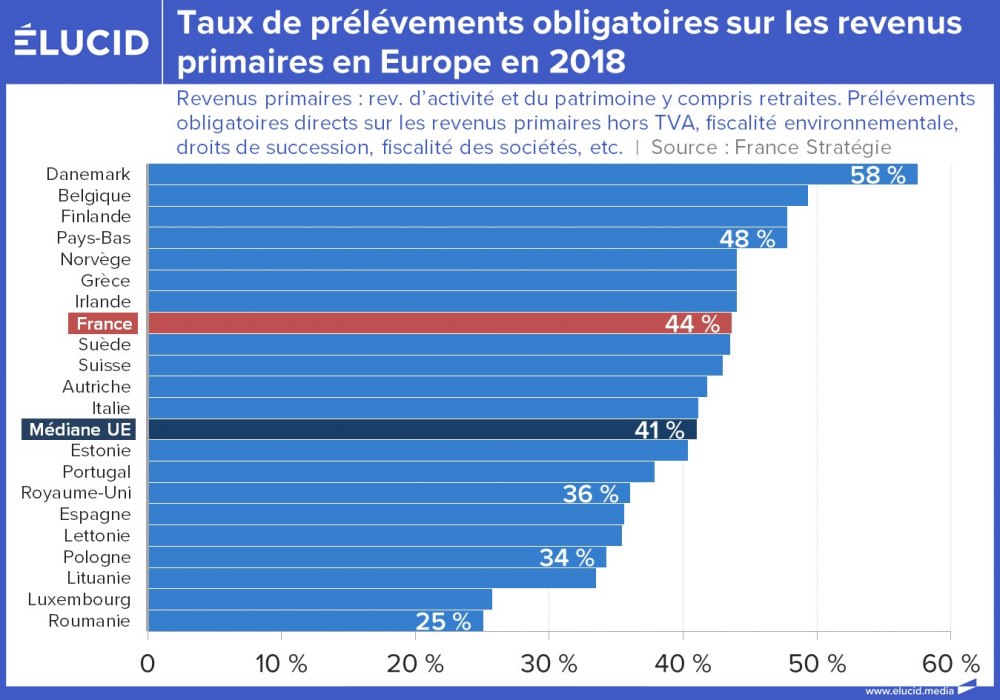 Selon France Stratégie (l’organisme d’expertise et d’analyse prospective placé auprès de la Première ministre), ces résultats français plutôt moyens sont obtenus après un taux de prélèvement certes élevé (43,7 % de prélèvements sur le revenu primaire) mais plus faible qu’au Danemark (57 %) ou qu’aux Pays-Bas (48 %). Ce niveau n’est par ailleurs pas très au-delà de la médiane européenne (41 %), relativisant l’idée d’une France « championne du monde » des prélèvements.