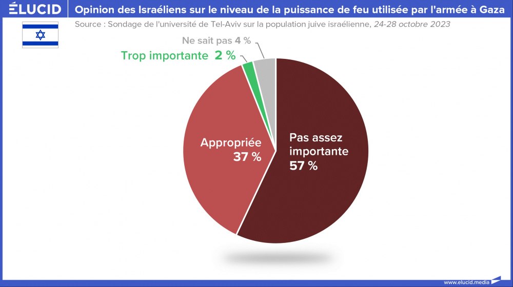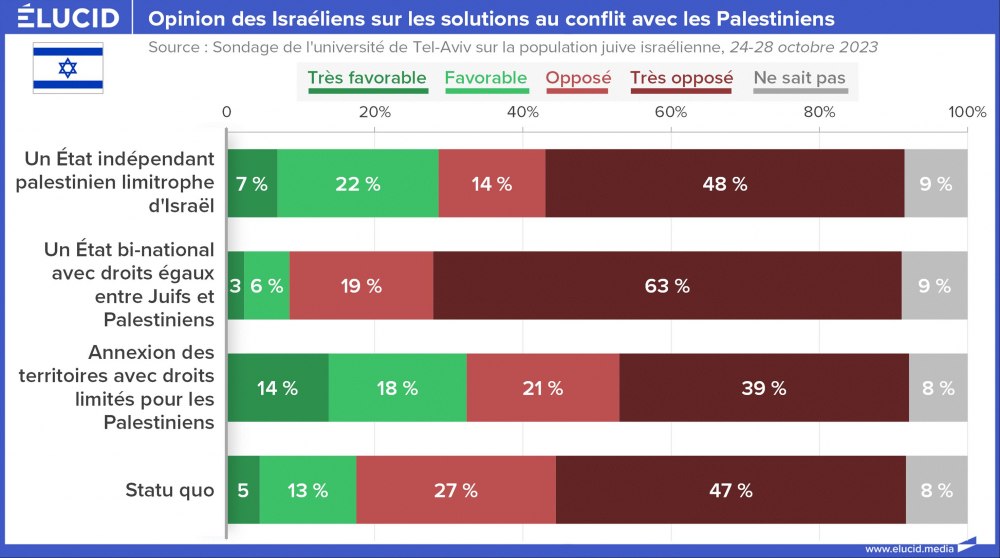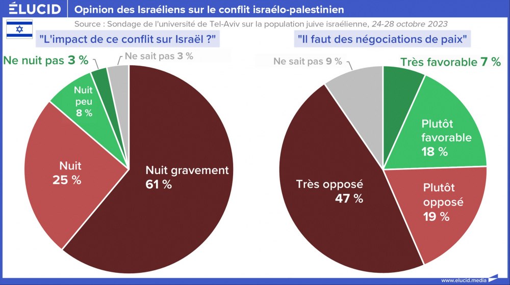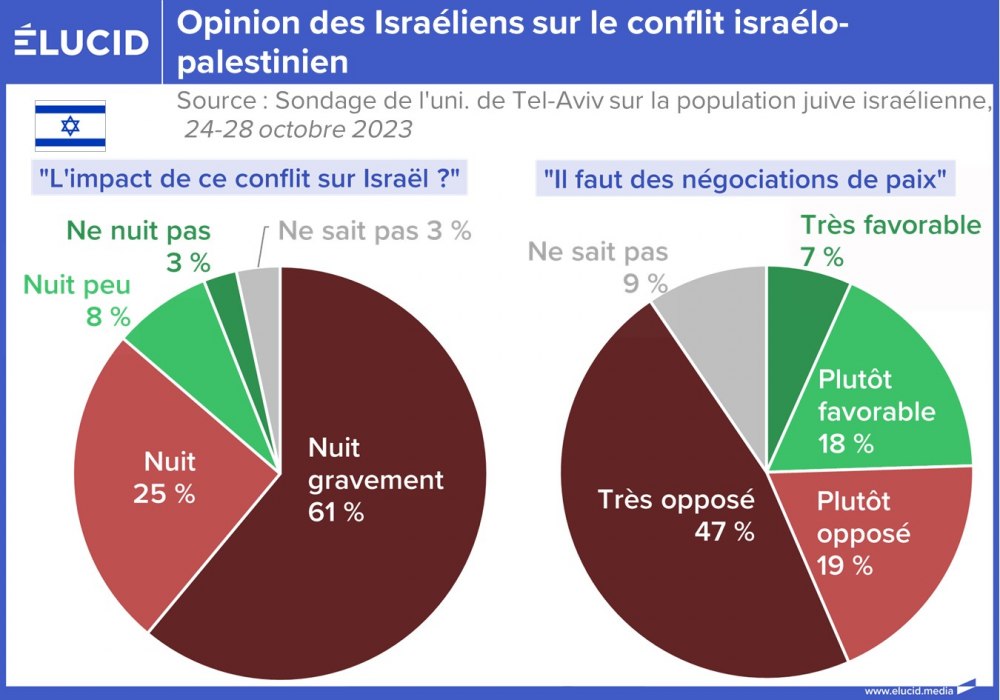 Plus généralement, de façon lucide, près de 90 % des Israéliens considèrent que le conflit israélo-palestinien nuit plus ou moins gravement au pays. Pourtant, 2 Israéliens sur 3 sont opposés à des négociations de paix.