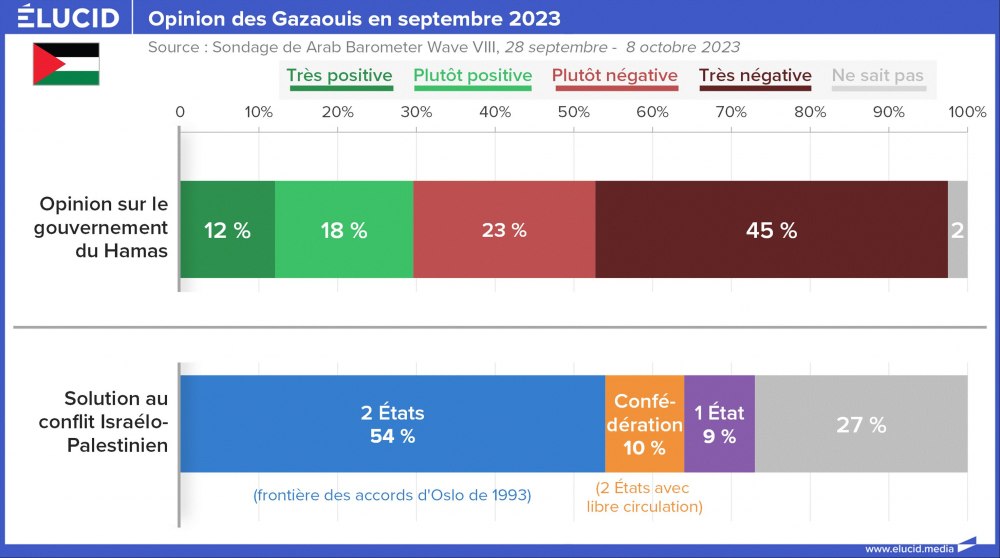 Enfin, quand on leur demande leur opinion sur différents pays et organisations, les Palestiniens déclarent désormais avoir une bonne opinion du Hamas à 90 % en Cisjordanie et 60 % à Gaza, et à 85 % pour le jihad islamique.